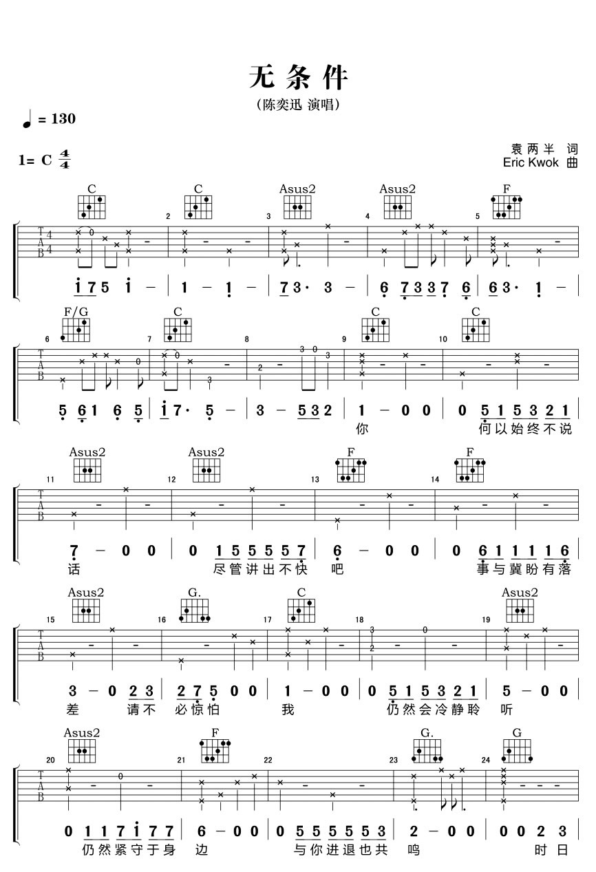 陈奕迅《无条件吉他谱》(c调)