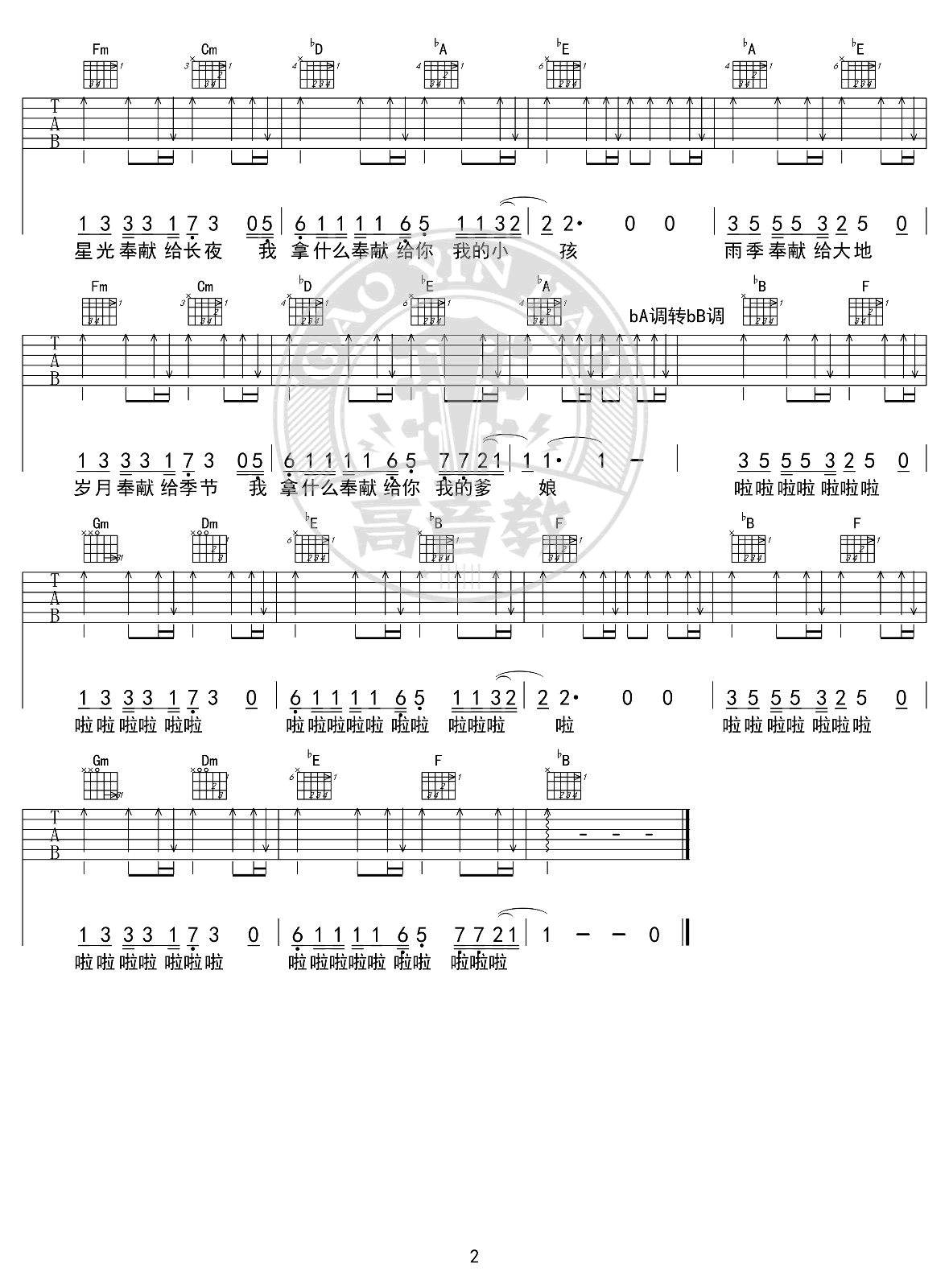 《苏芮《奉献吉他谱》(G调)》内容来自于互联网,不能保证内容的准确性与完整性,仅供学习交流欣赏,请勿用于其它用途,内容版权归原作者及来源网站所有,如有侵犯到您的权益请来信告知,我们将及时删除。