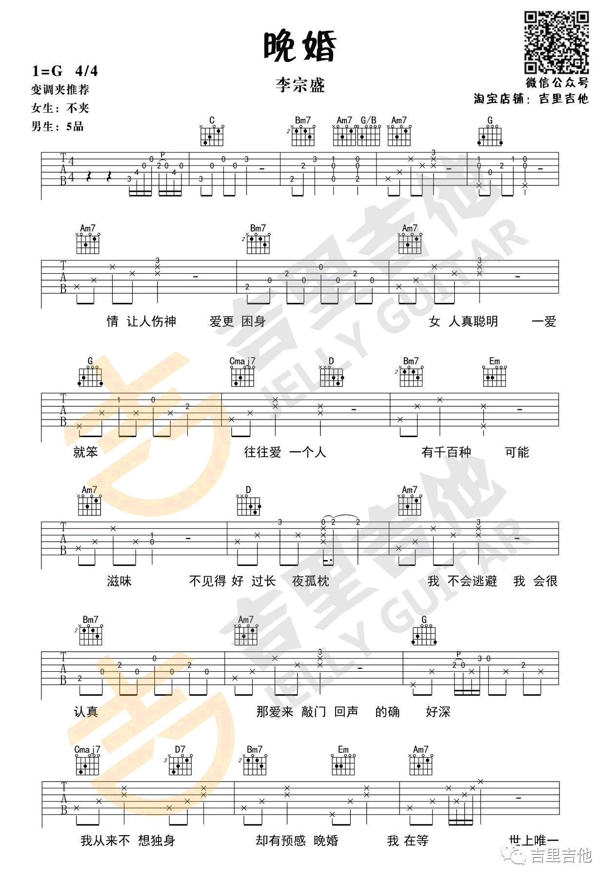 《李宗盛《晚婚吉他谱》(G调)》内容来自于互联网,不能保证内容的准确性与完整性,仅供学习交流欣赏,请勿用于其它用途,内容版权归原作者及来源网站所有,如有侵犯到您的权益请来信告知,我们将及时删除。