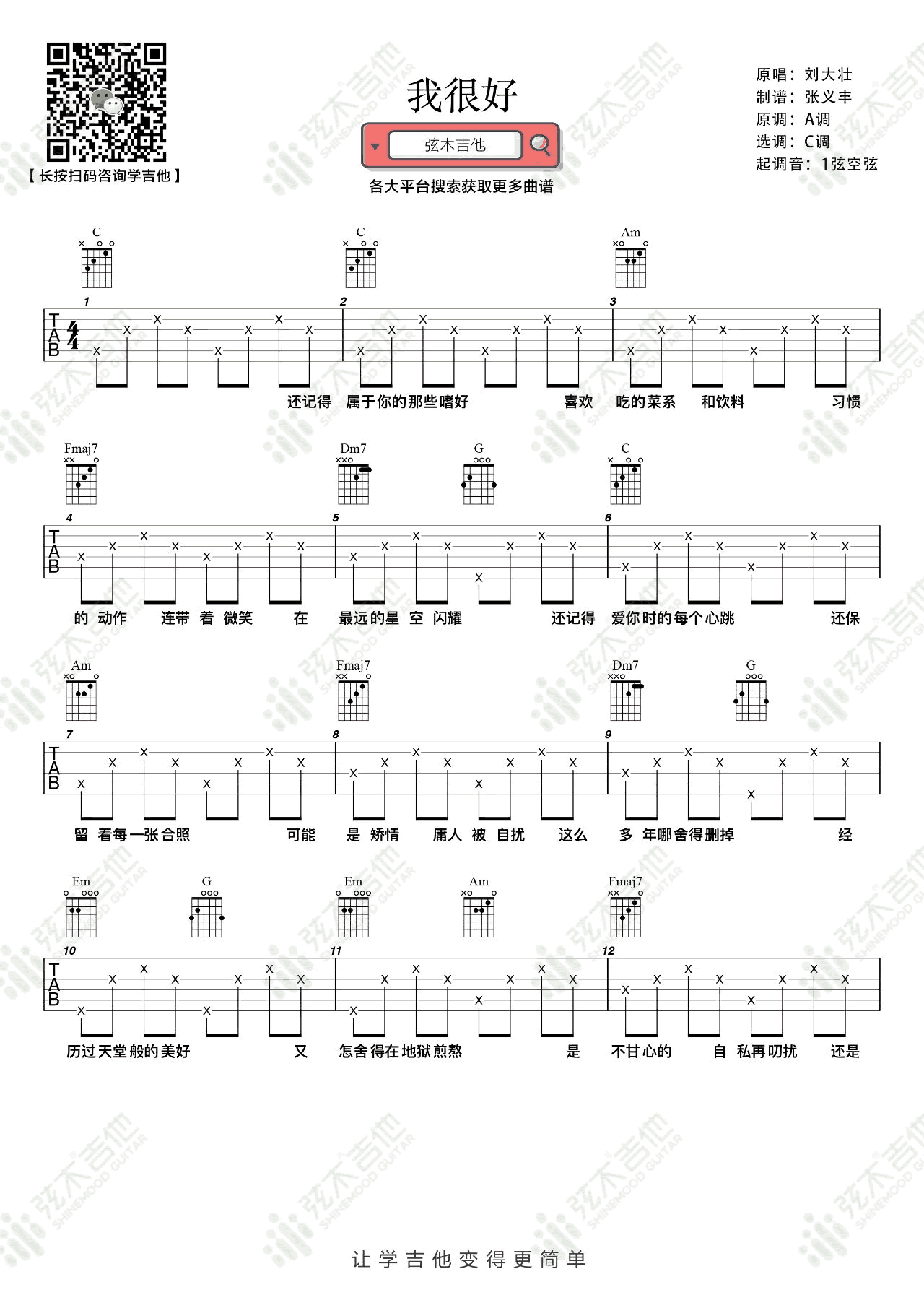 《刘大壮《我很好吉他谱》(C调)》内容来自于互联网,不能保证内容的准确性与完整性,仅供学习交流欣赏,请勿用于其它用途,内容版权归原作者及来源网站所有,如有侵犯到您的权益请来信告知,我们将及时删除。