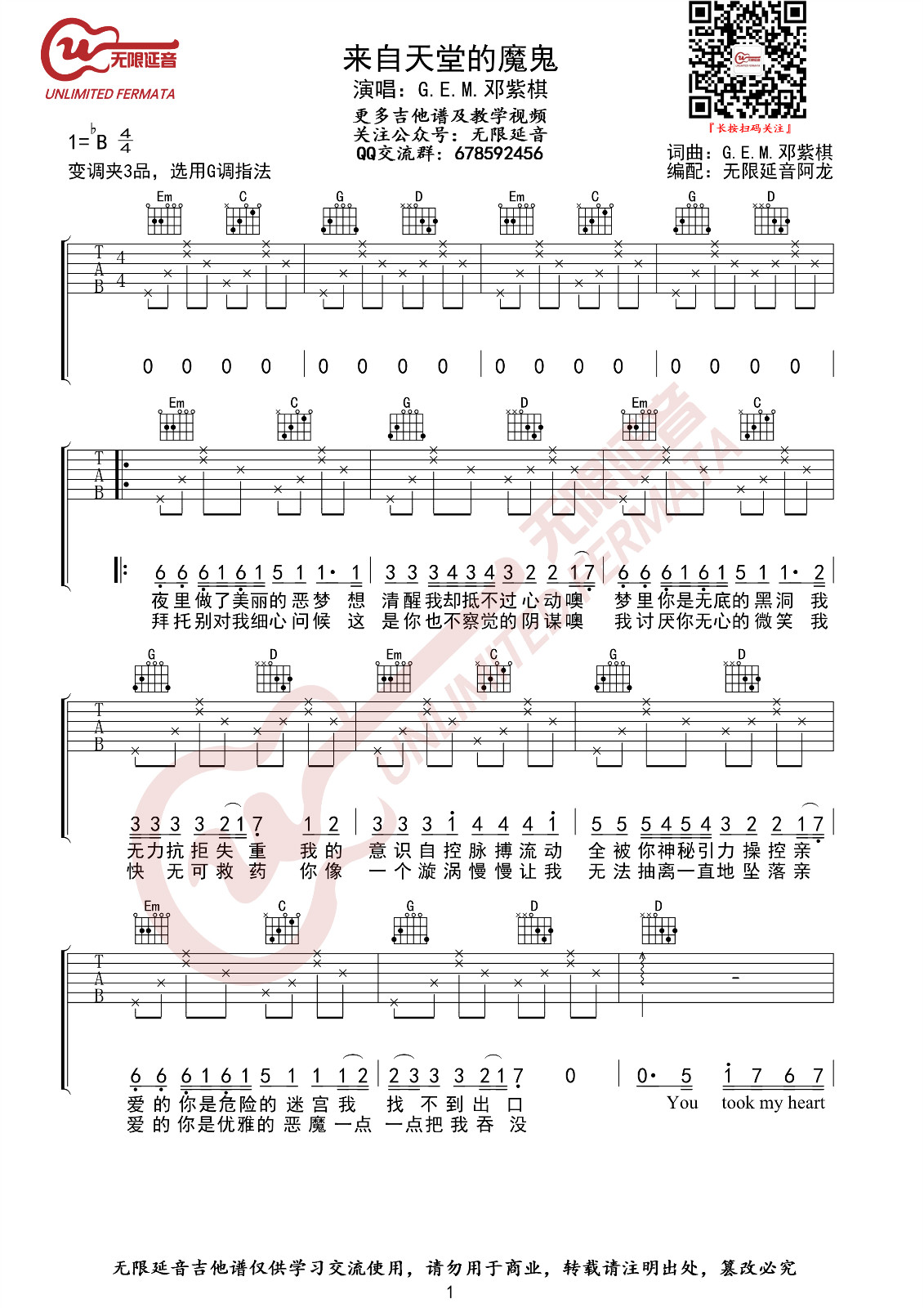 《邓紫棋《来自天堂的魔鬼吉他谱》》内容来自于互联网,不能保证内容的准确性与完整性,仅供学习交流欣赏,请勿用于其它用途,内容版权归原作者及来源网站所有,如有侵犯到您的权益请来信告知,我们将及时删除。