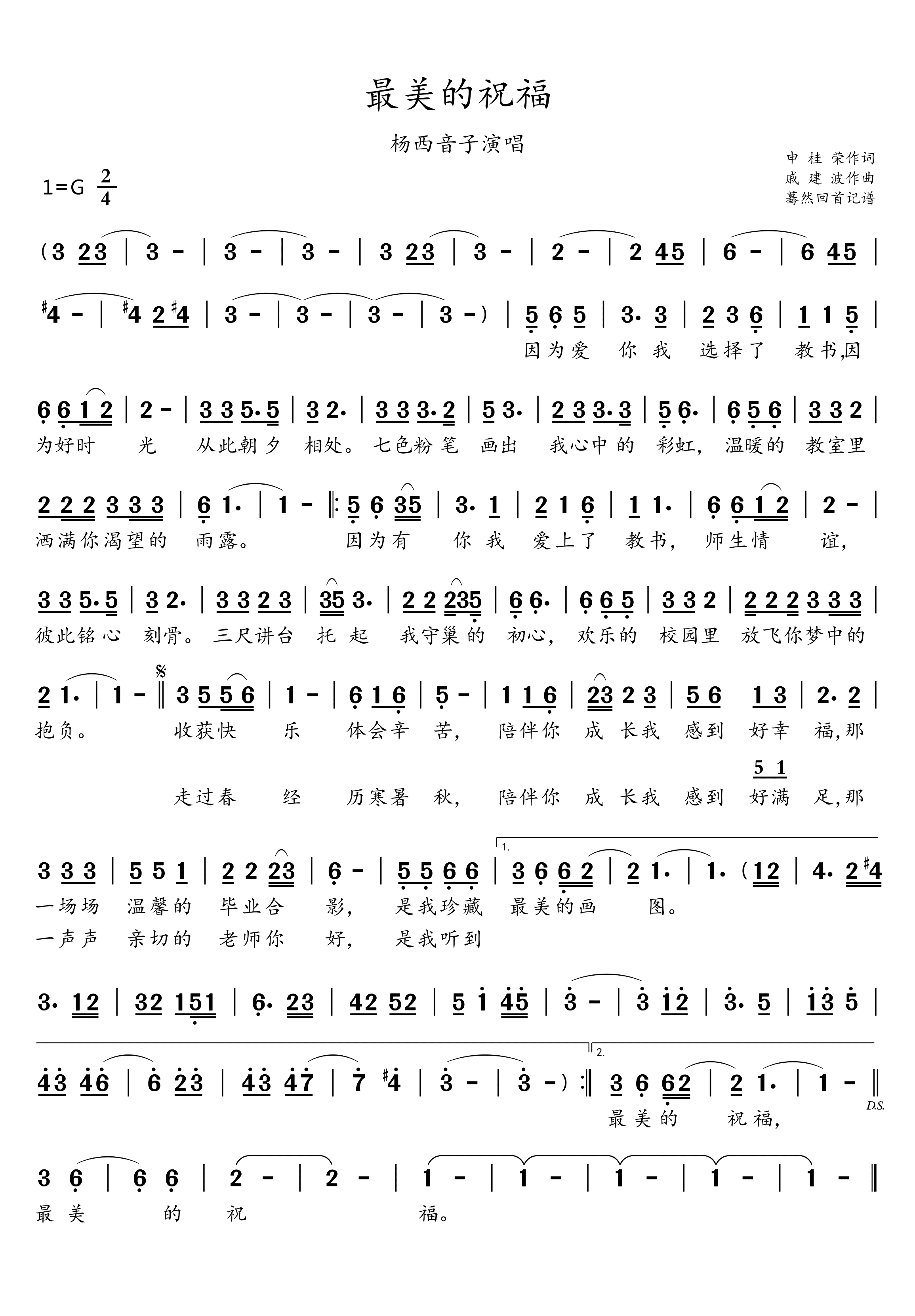 《杨西音子《最美的祝福简谱》》内容来自于互联网,不能保证内容的准确性与完整性,仅供学习交流欣赏,请勿用于其它用途,内容版权归原作者及来源网站所有,如有侵犯到您的权益请来信告知,我们将及时删除。