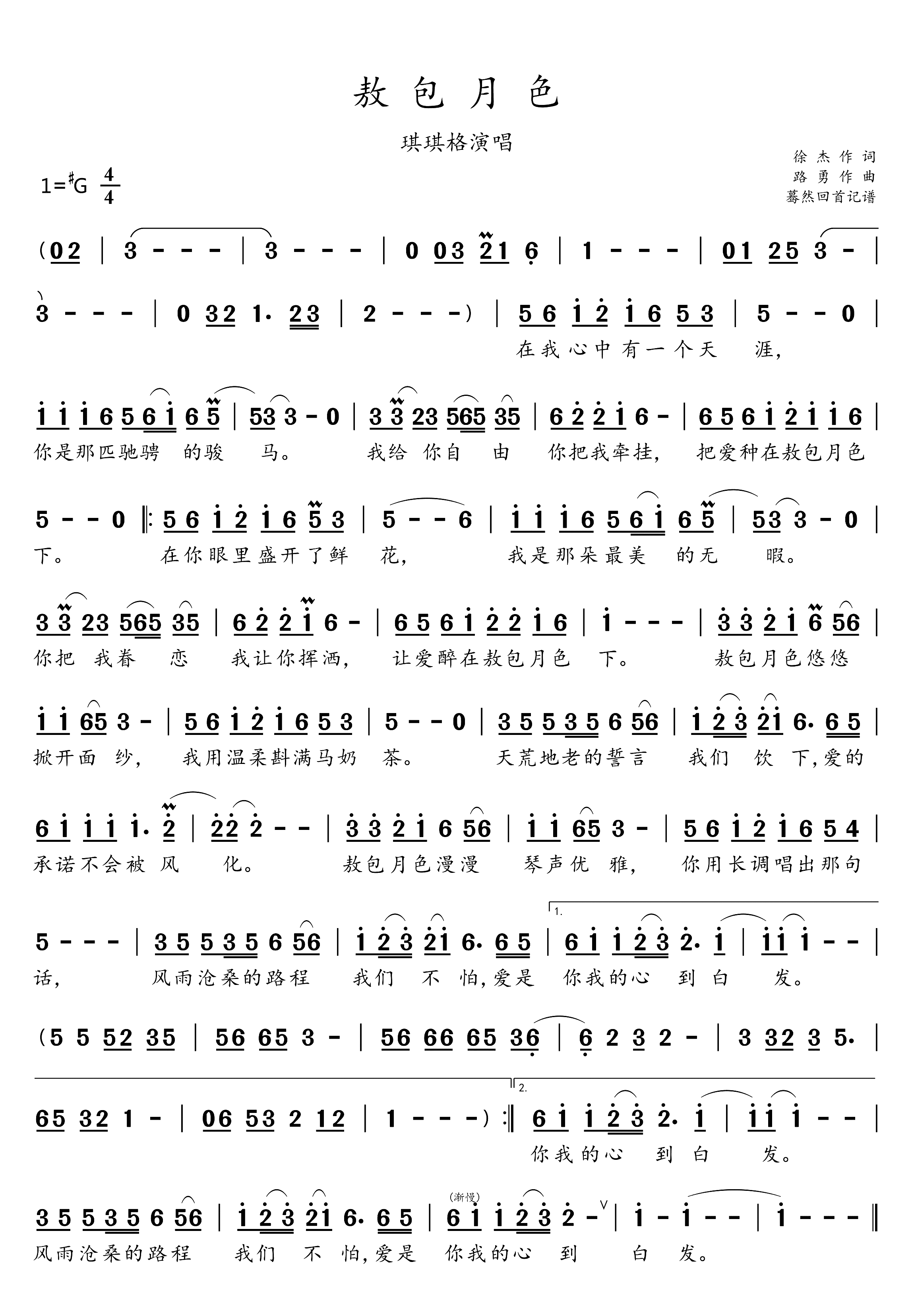 《琪琪格《敖包月色简谱》》内容来自于互联网,不能保证内容的准确性与完整性,仅供学习交流欣赏,请勿用于其它用途,内容版权归原作者及来源网站所有,如有侵犯到您的权益请来信告知,我们将及时删除。