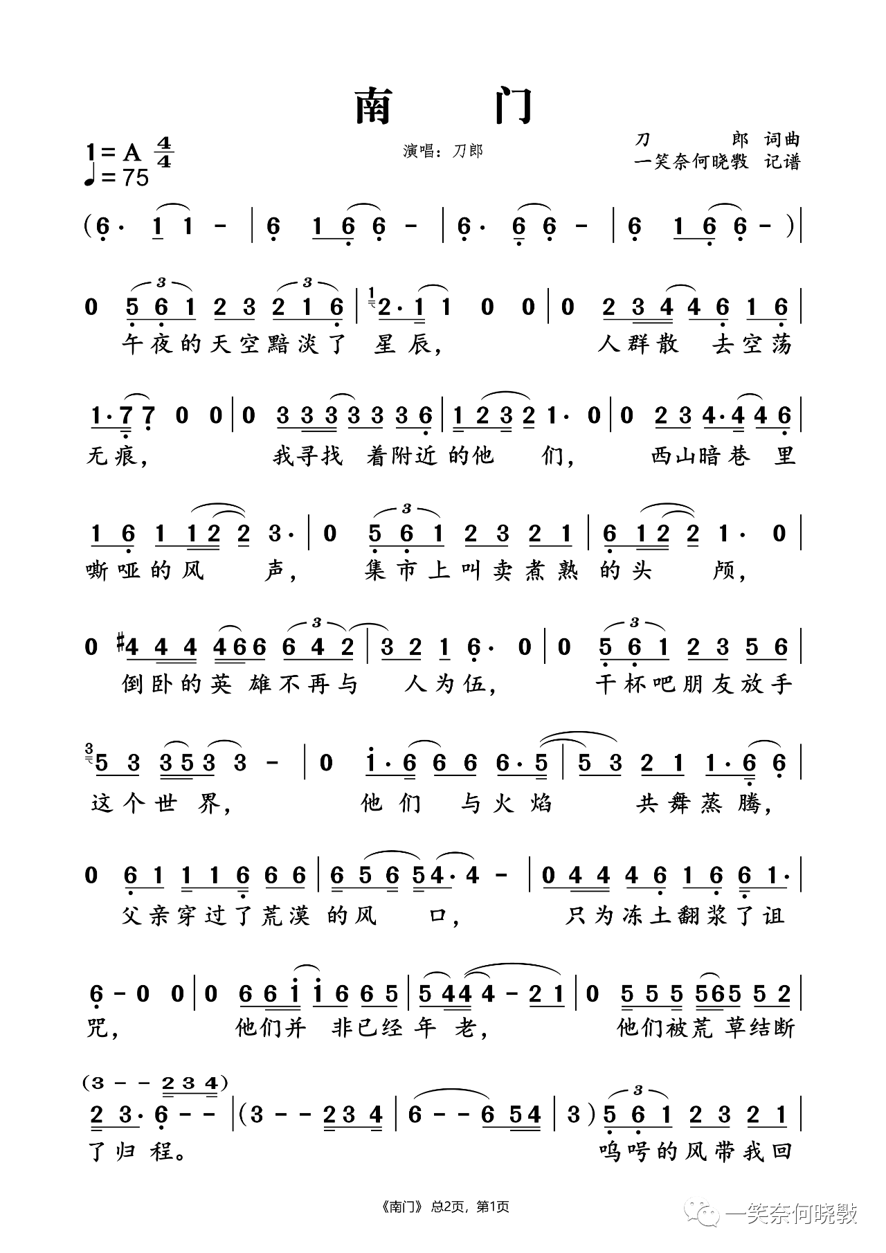 《刀郎《南门简谱》》内容来自于互联网,不能保证内容的准确性与完整性,仅供学习交流欣赏,请勿用于其它用途,内容版权归原作者及来源网站所有,如有侵犯到您的权益请来信告知,我们将及时删除。