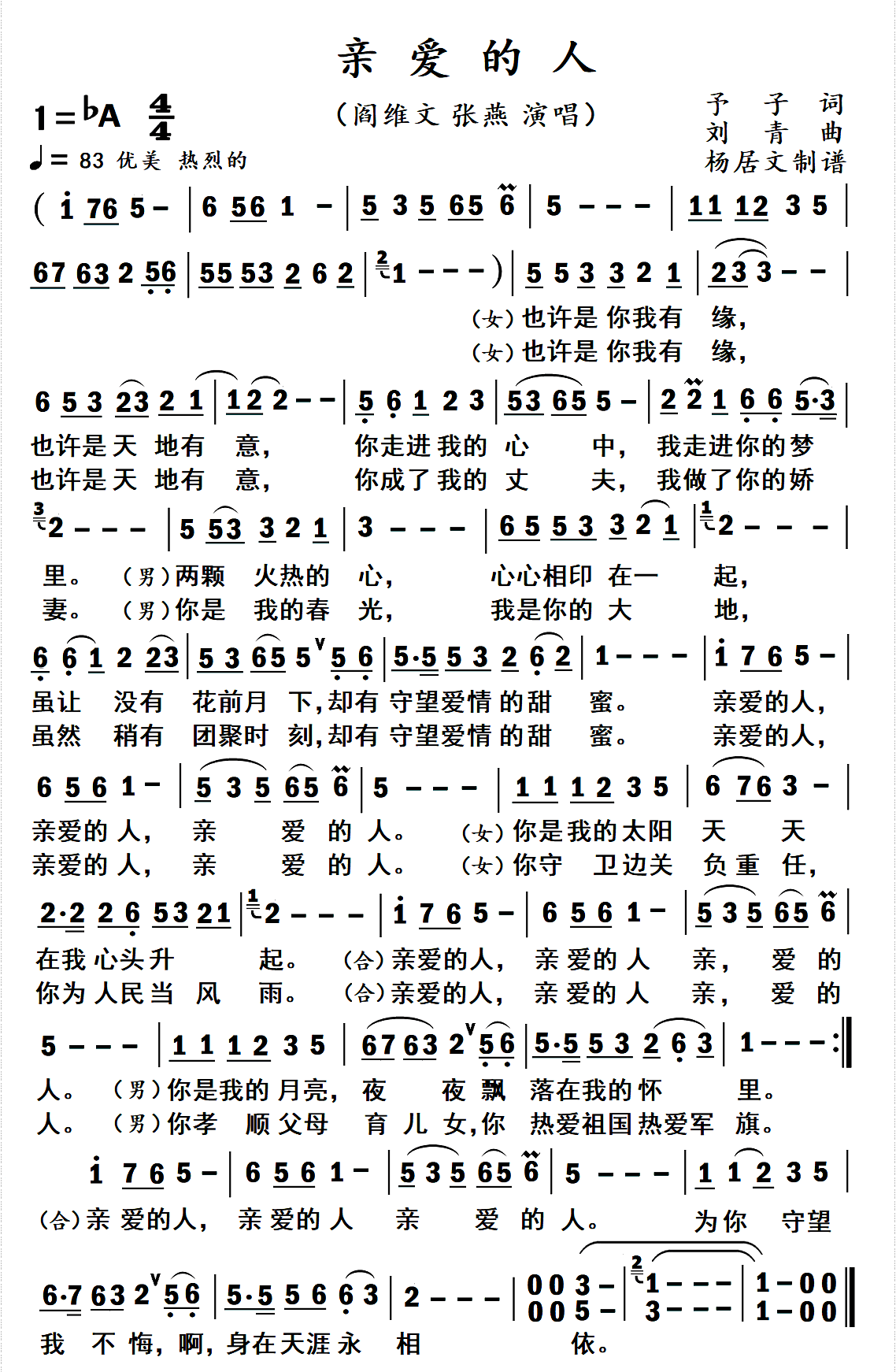 阎维文/张燕《亲爱的人简谱》