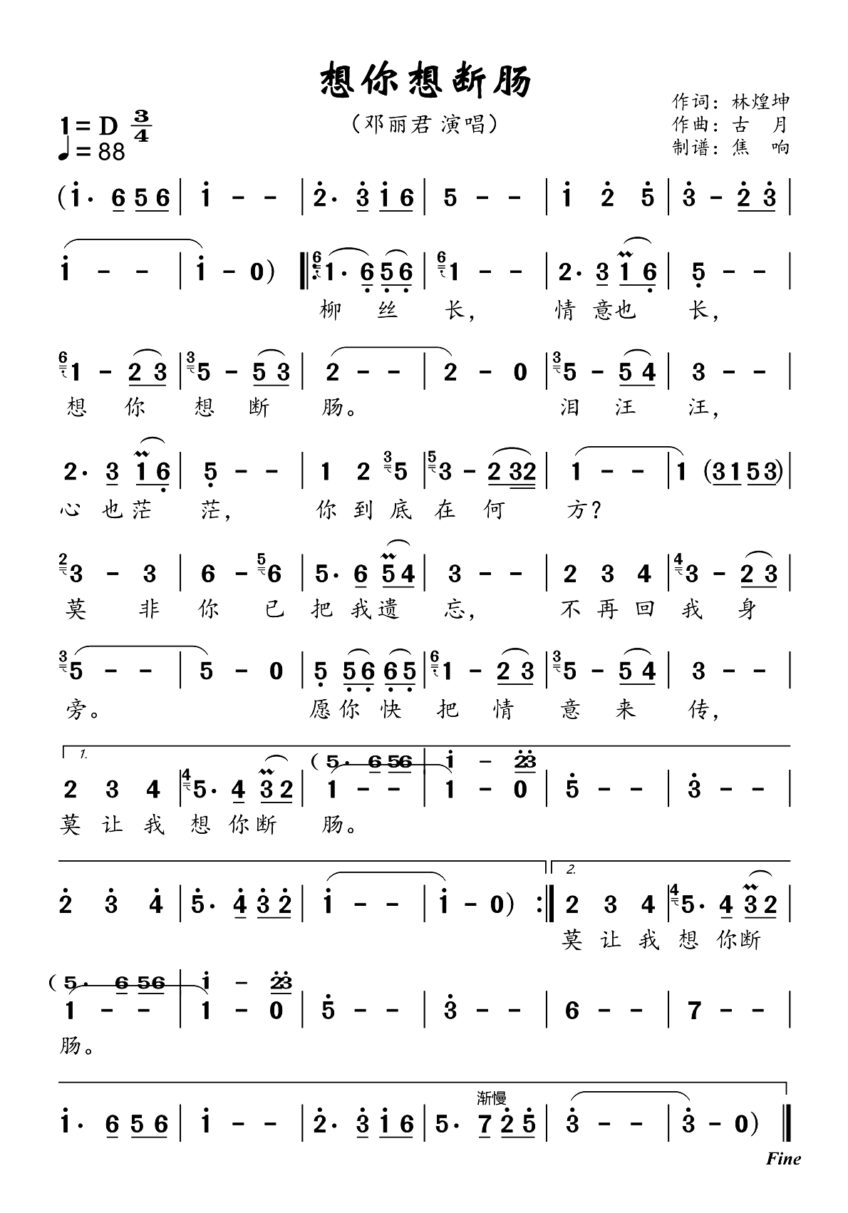 《邓丽君《想你想断肠简谱》》内容来自于互联网,不能保证内容的准确性与完整性,仅供学习交流欣赏,请勿用于其它用途,内容版权归原作者及来源网站所有,如有侵犯到您的权益请来信告知,我们将及时删除。