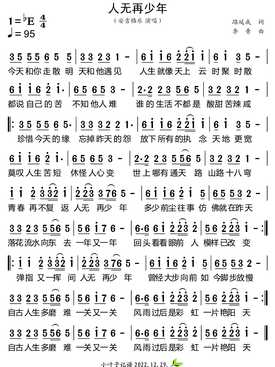 《安吉格乐《人无再少年简谱》》内容来自于互联网,不能保证内容的准确性与完整性,仅供学习交流欣赏,请勿用于其它用途,内容版权归原作者及来源网站所有,如有侵犯到您的权益请来信告知,我们将及时删除。