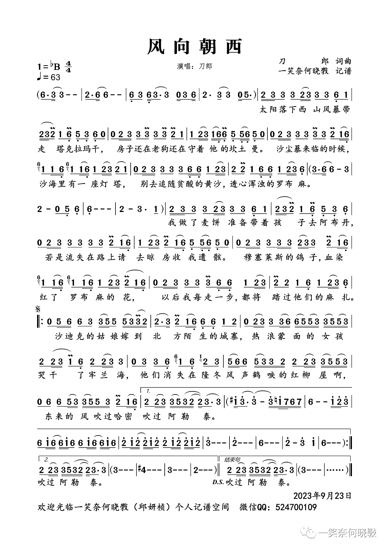《刀郎《风向朝西简谱》》内容来自于互联网,不能保证内容的准确性与完整性,仅供学习交流欣赏,请勿用于其它用途,内容版权归原作者及来源网站所有,如有侵犯到您的权益请来信告知,我们将及时删除。