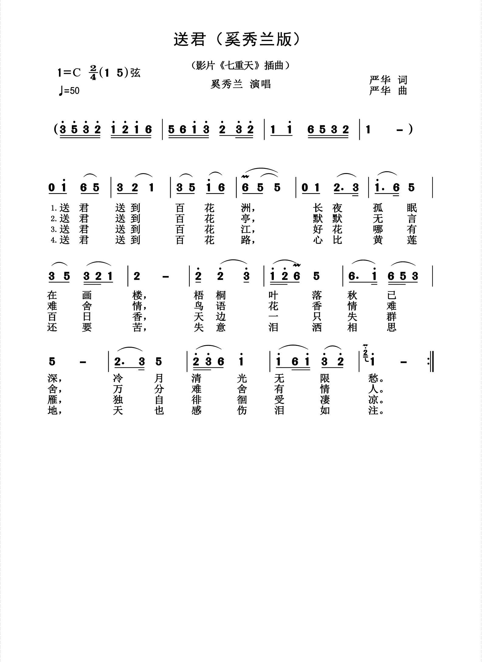 《奚秀兰《送君奚秀兰版简谱》》内容来自于互联网,不能保证内容的准确性与完整性,仅供学习交流欣赏,请勿用于其它用途,内容版权归原作者及来源网站所有,如有侵犯到您的权益请来信告知,我们将及时删除。