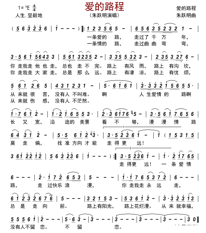 《朱跃明《爱的路程简谱》》内容来自于互联网,不能保证内容的准确性与完整性,仅供学习交流欣赏,请勿用于其它用途,内容版权归原作者及来源网站所有,如有侵犯到您的权益请来信告知,我们将及时删除。