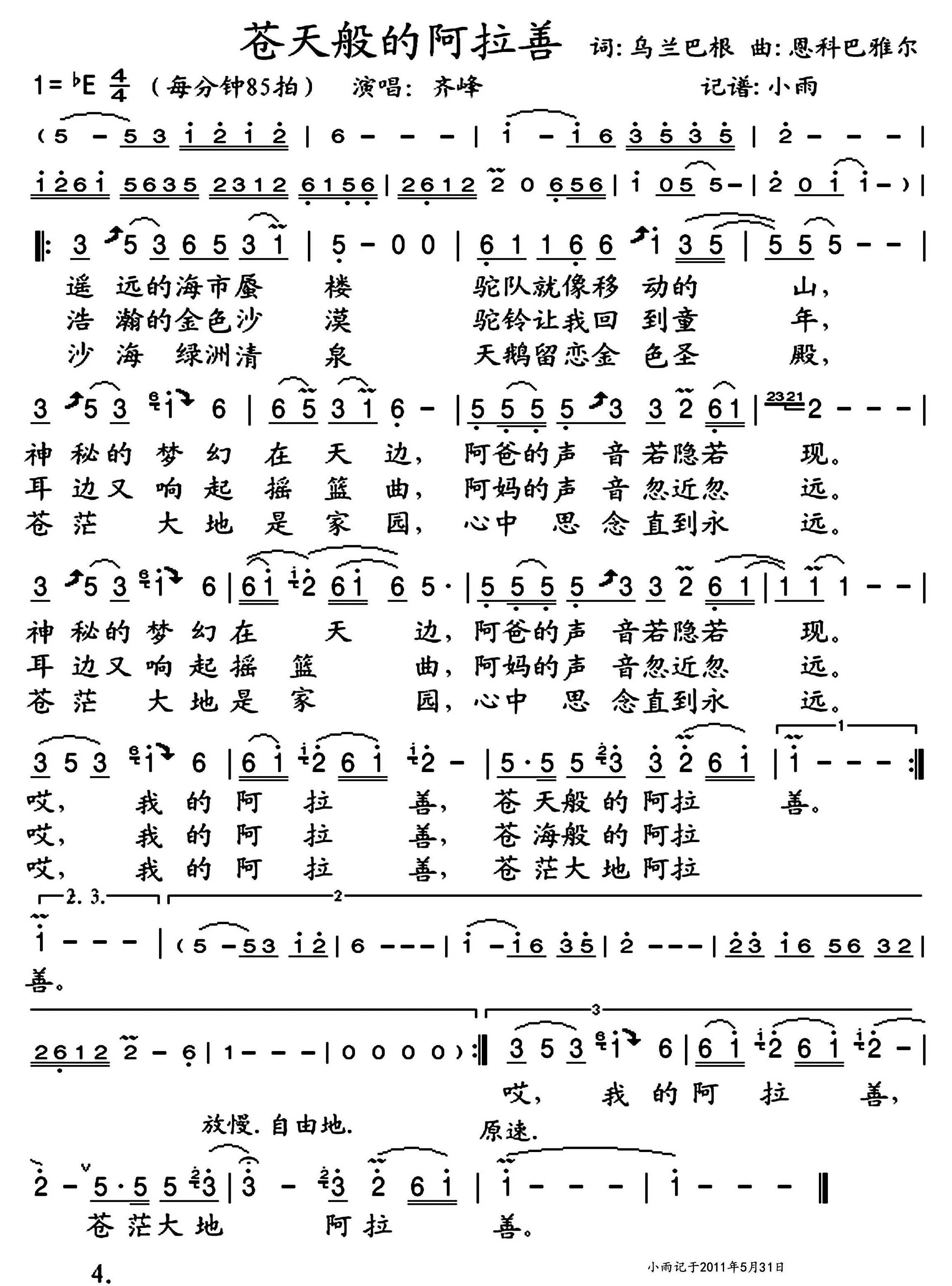 《齐峰《苍天般的阿拉善简谱》》内容来自于互联网,不能保证内容的准确性与完整性,仅供学习交流欣赏,请勿用于其它用途,内容版权归原作者及来源网站所有,如有侵犯到您的权益请来信告知,我们将及时删除。