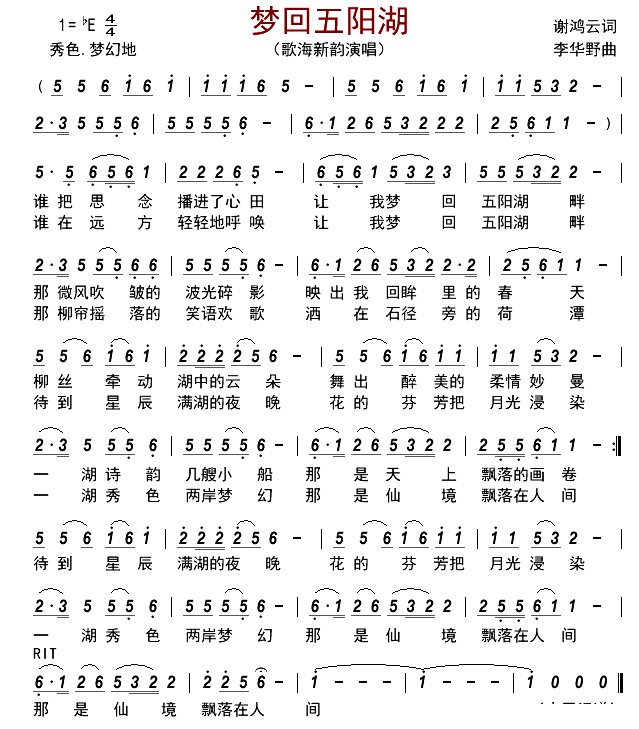 歌海新韵《梦回五阳湖简谱》