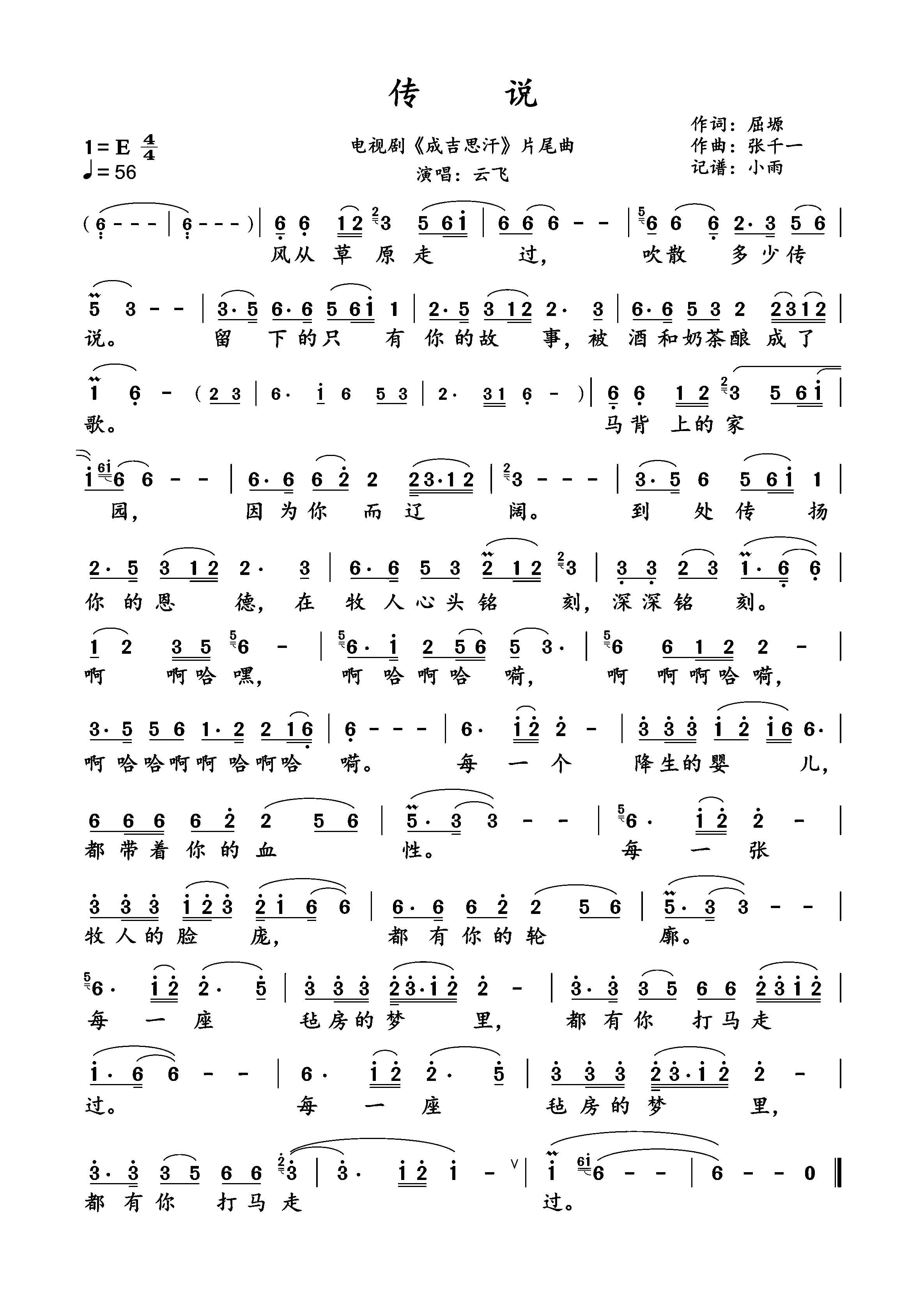 《云飞《传说简谱》》内容来自于互联网,不能保证内容的准确性与完整性,仅供学习交流欣赏,请勿用于其它用途,内容版权归原作者及来源网站所有,如有侵犯到您的权益请来信告知,我们将及时删除。