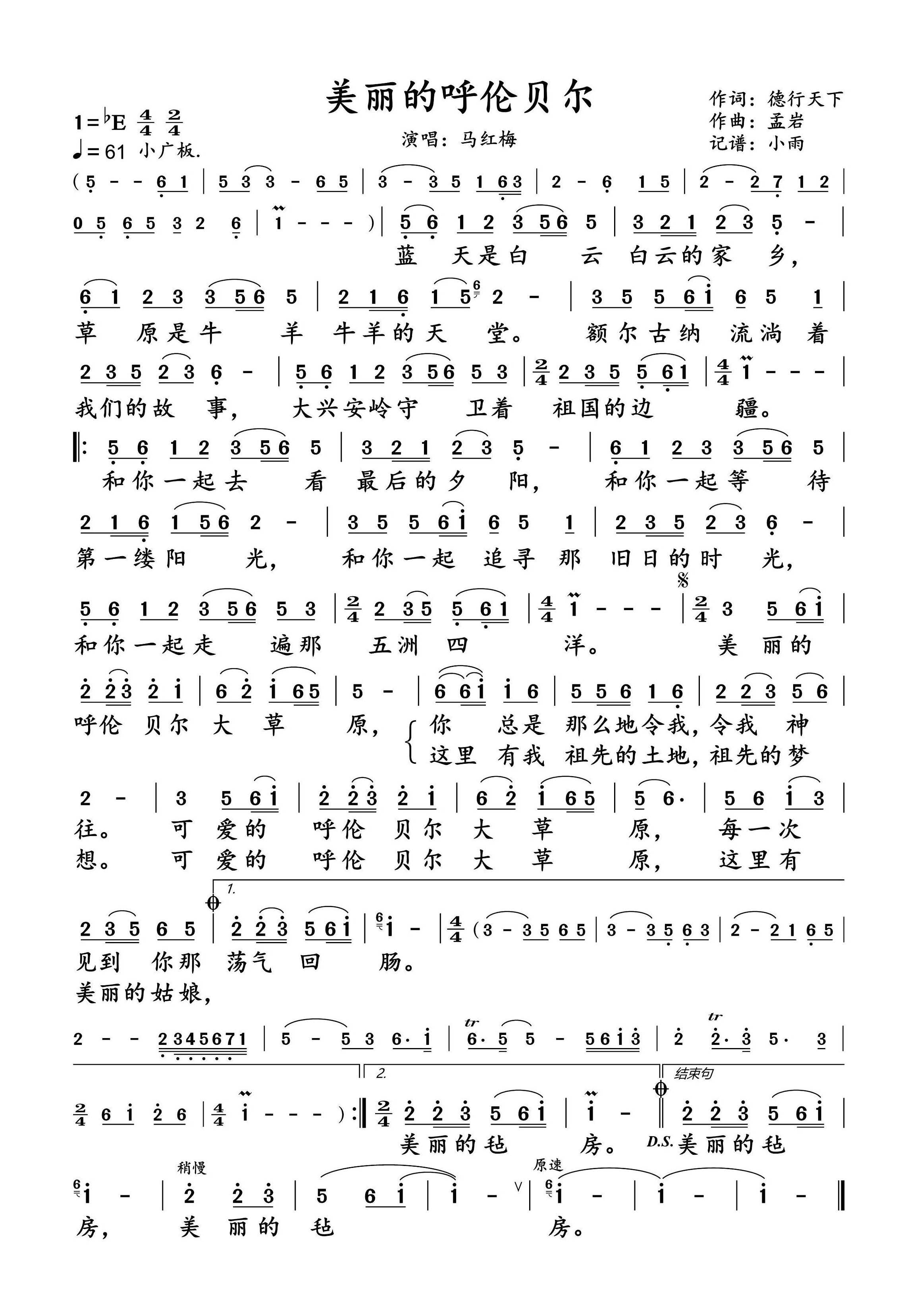 《马红梅《美丽的呼伦贝尔简谱》》内容来自于互联网,不能保证内容的准确性与完整性,仅供学习交流欣赏,请勿用于其它用途,内容版权归原作者及来源网站所有,如有侵犯到您的权益请来信告知,我们将及时删除。
