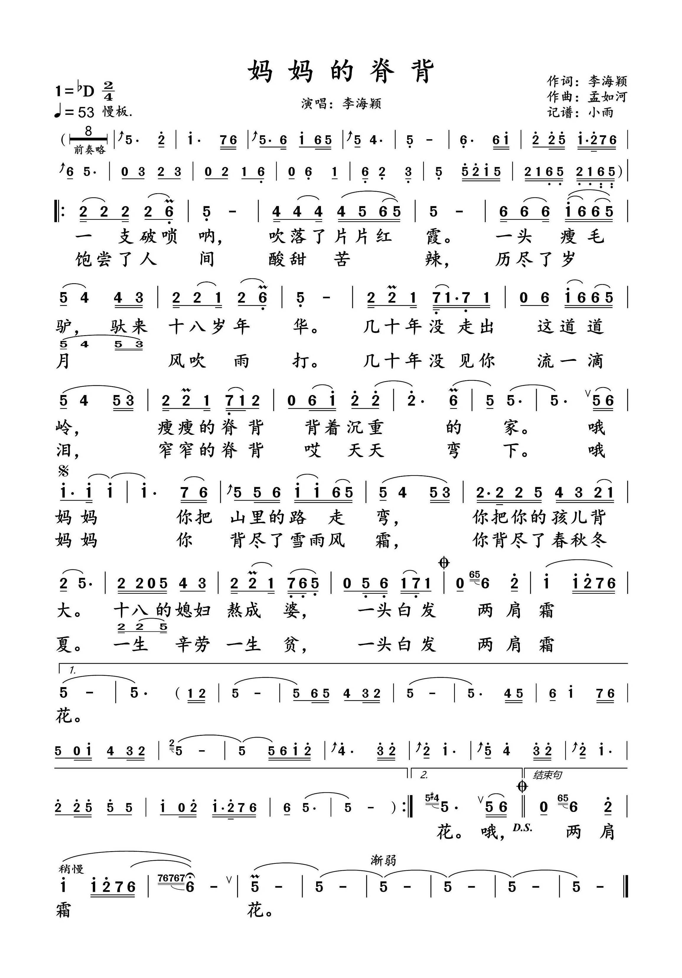 《李海颖《妈妈的脊背简谱》》内容来自于互联网,不能保证内容的准确性与完整性,仅供学习交流欣赏,请勿用于其它用途,内容版权归原作者及来源网站所有,如有侵犯到您的权益请来信告知,我们将及时删除。