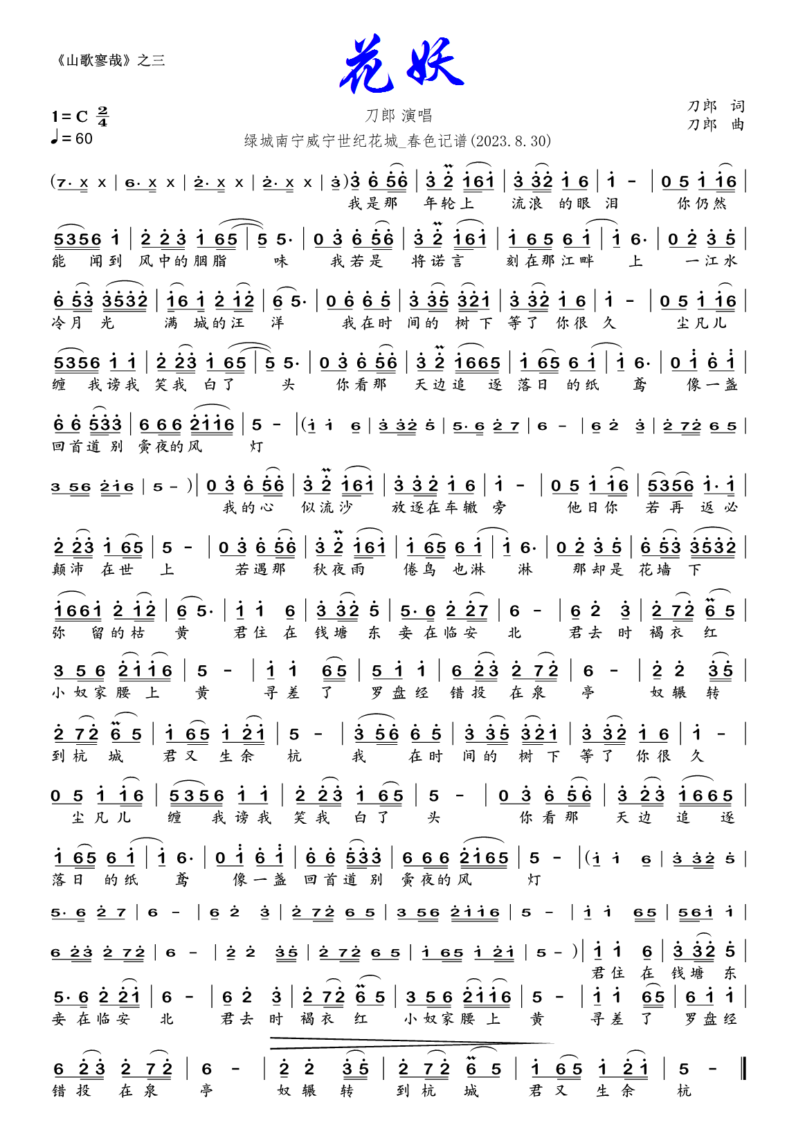 《刀郎《花妖简谱》》内容来自于互联网,不能保证内容的准确性与完整性,仅供学习交流欣赏,请勿用于其它用途,内容版权归原作者及来源网站所有,如有侵犯到您的权益请来信告知,我们将及时删除。