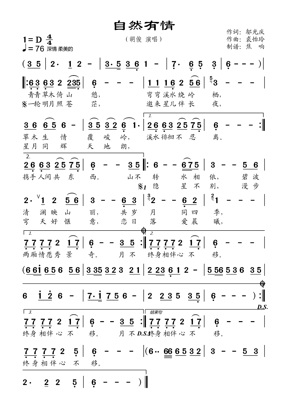 《胡俊《自然有情简谱》》内容来自于互联网,不能保证内容的准确性与完整性,仅供学习交流欣赏,请勿用于其它用途,内容版权归原作者及来源网站所有,如有侵犯到您的权益请来信告知,我们将及时删除。