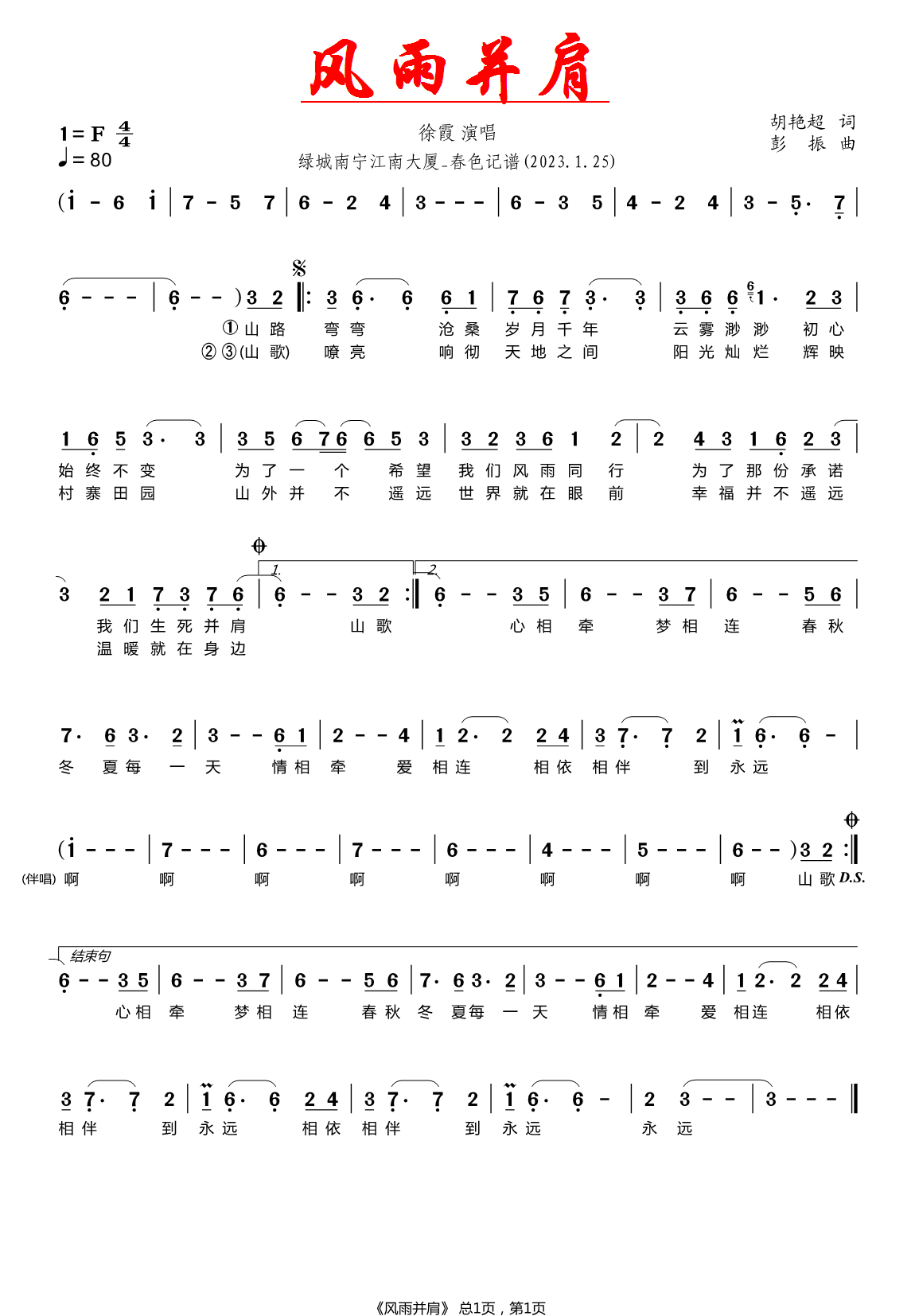 《徐霞《风雨并肩简谱》》内容来自于互联网,不能保证内容的准确性与完整性,仅供学习交流欣赏,请勿用于其它用途,内容版权归原作者及来源网站所有,如有侵犯到您的权益请来信告知,我们将及时删除。