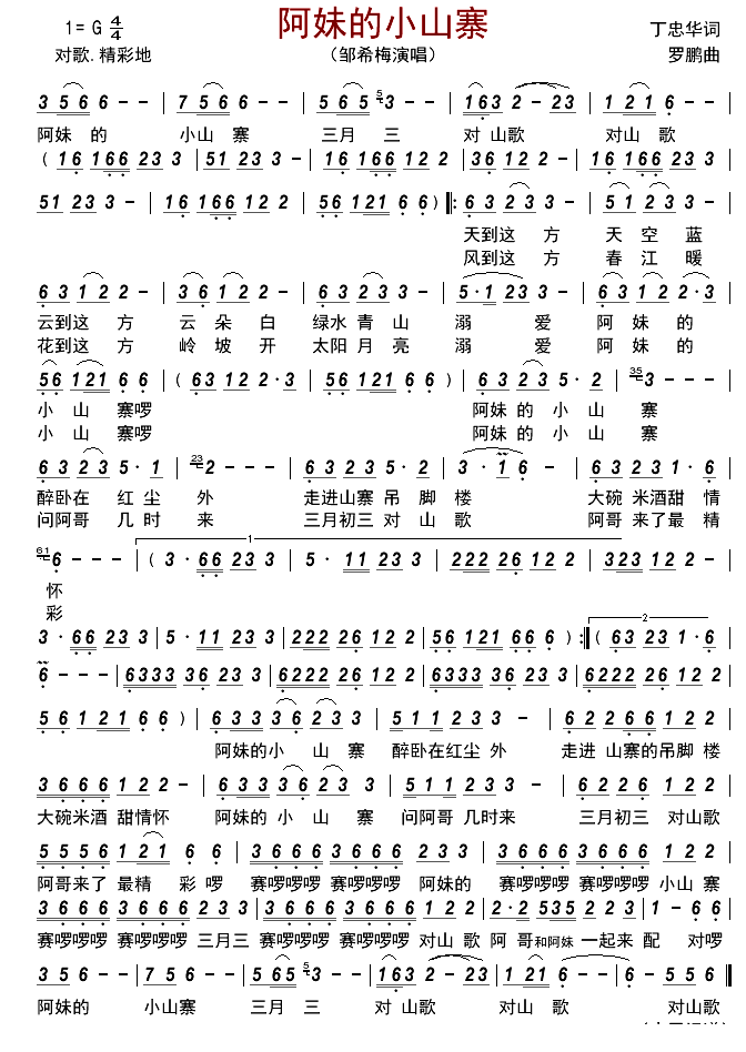 《邹希梅《阿妹的小山寨简谱》》内容来自于互联网,不能保证内容的准确性与完整性,仅供学习交流欣赏,请勿用于其它用途,内容版权归原作者及来源网站所有,如有侵犯到您的权益请来信告知,我们将及时删除。