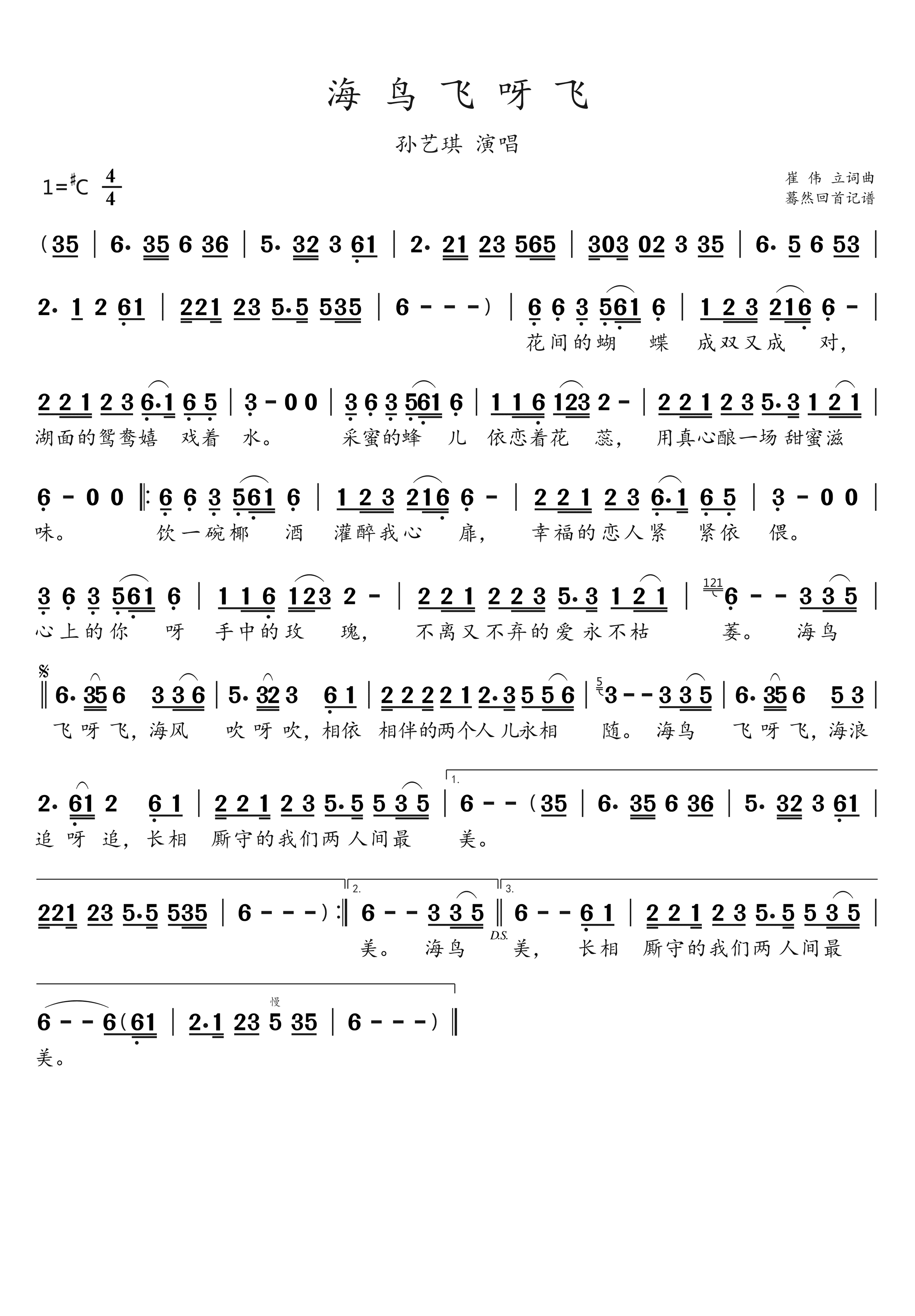《孙艺琪《海鸟飞呀飞简谱》》内容来自于互联网,不能保证内容的准确性与完整性,仅供学习交流欣赏,请勿用于其它用途,内容版权归原作者及来源网站所有,如有侵犯到您的权益请来信告知,我们将及时删除。