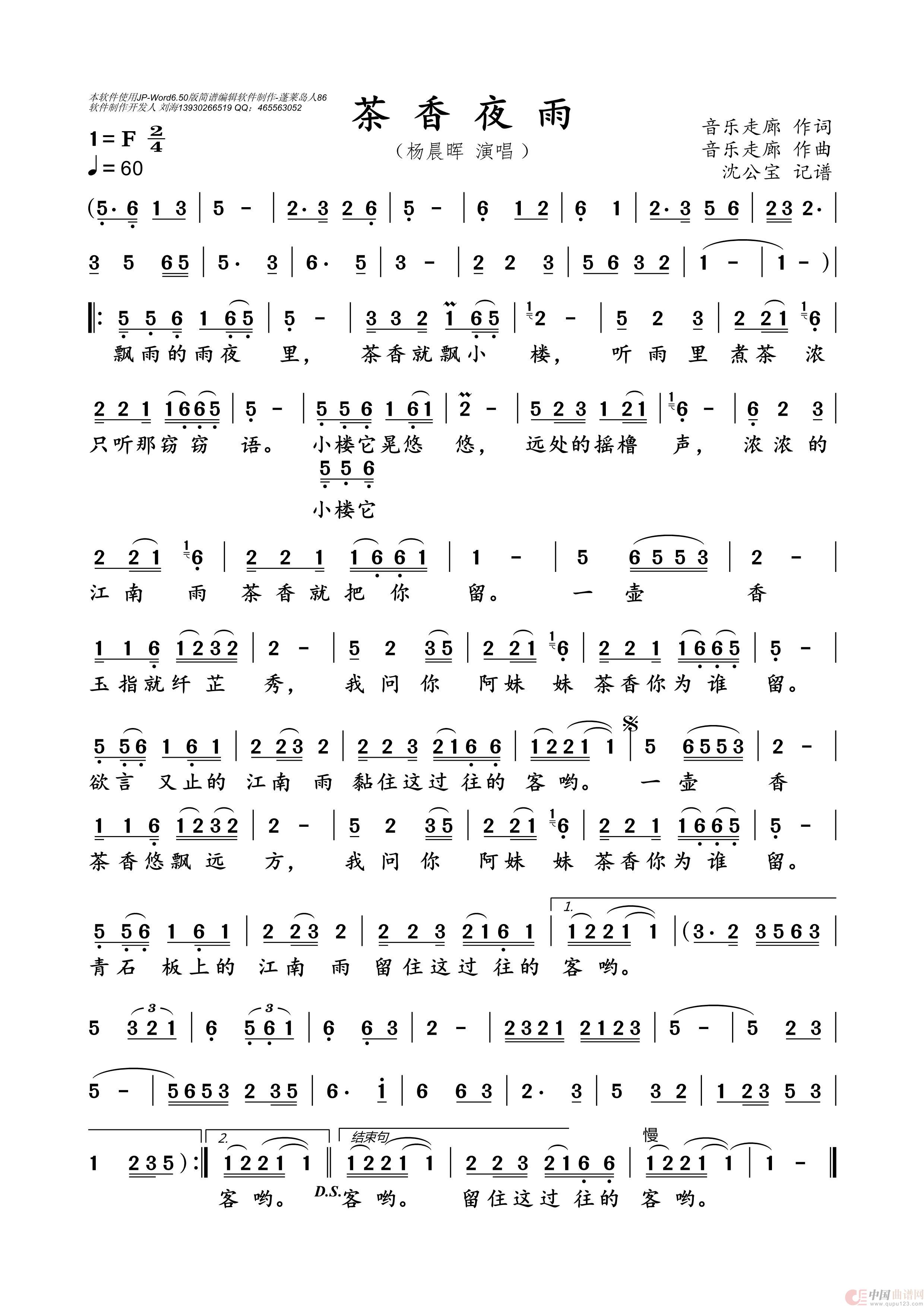 《杨晨晖《茶香夜雨简谱》》内容来自于互联网,不能保证内容的准确性与完整性,仅供学习交流欣赏,请勿用于其它用途,内容版权归原作者及来源网站所有,如有侵犯到您的权益请来信告知,我们将及时删除。