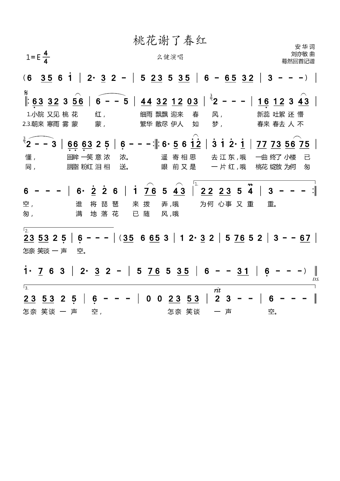 《《桃花谢了春红简谱》》内容来自于互联网,不能保证内容的准确性与完整性,仅供学习交流欣赏,请勿用于其它用途,内容版权归原作者及来源网站所有,如有侵犯到您的权益请来信告知,我们将及时删除。
