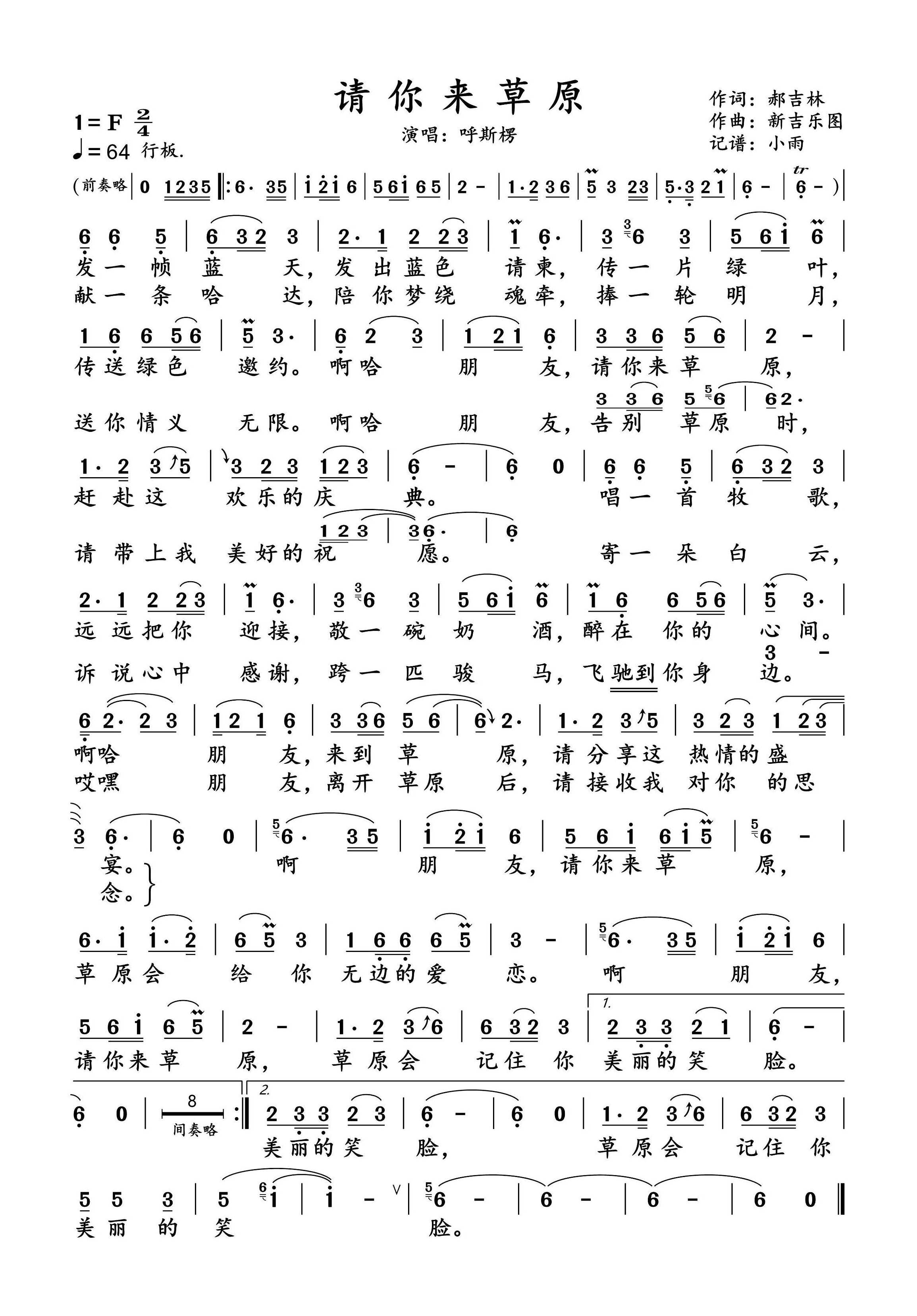 《呼斯楞《请你来草原简谱》》内容来自于互联网,不能保证内容的准确性与完整性,仅供学习交流欣赏,请勿用于其它用途,内容版权归原作者及来源网站所有,如有侵犯到您的权益请来信告知,我们将及时删除。
