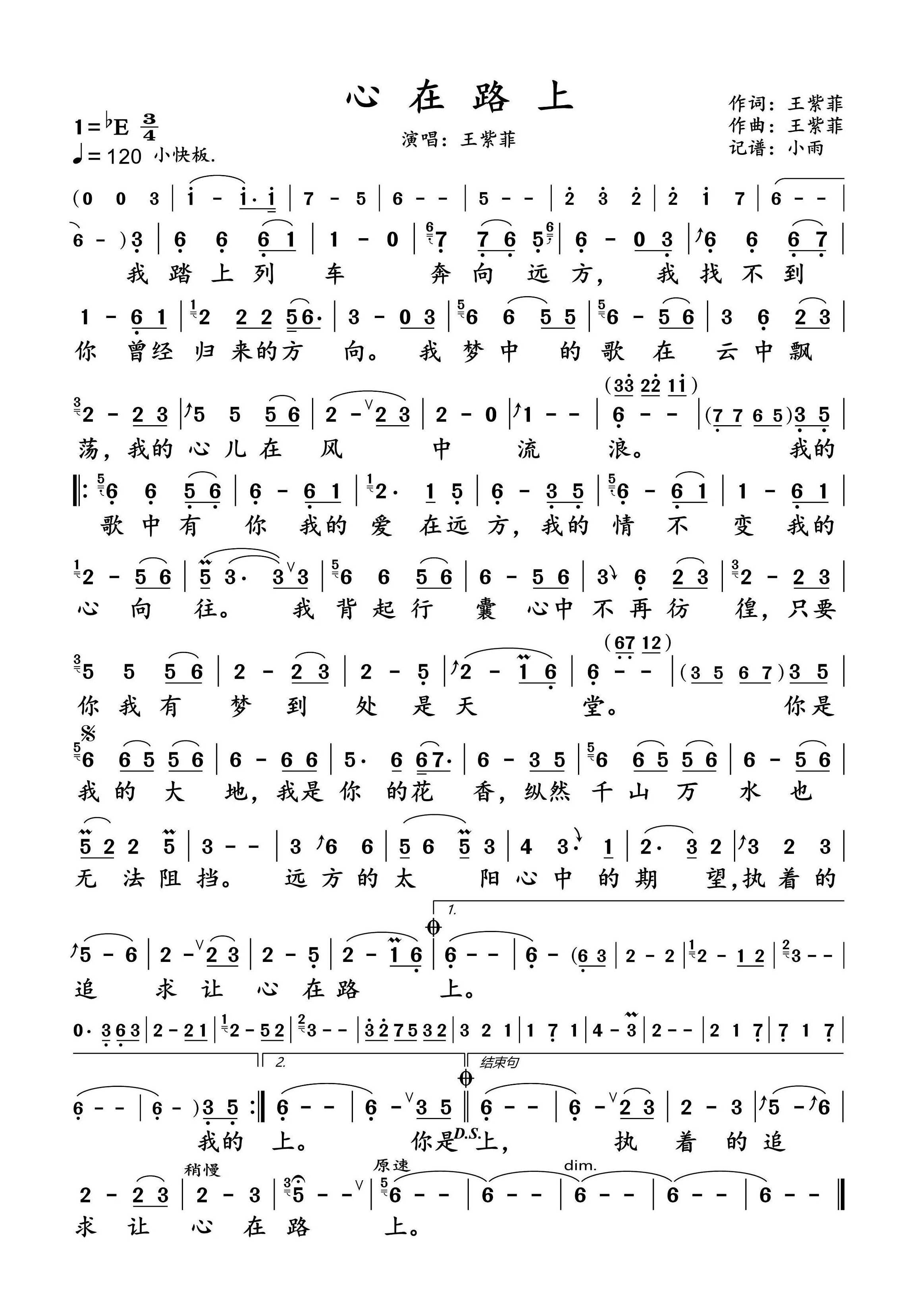 《王紫菲《心在路上简谱》》内容来自于互联网,不能保证内容的准确性与完整性,仅供学习交流欣赏,请勿用于其它用途,内容版权归原作者及来源网站所有,如有侵犯到您的权益请来信告知,我们将及时删除。