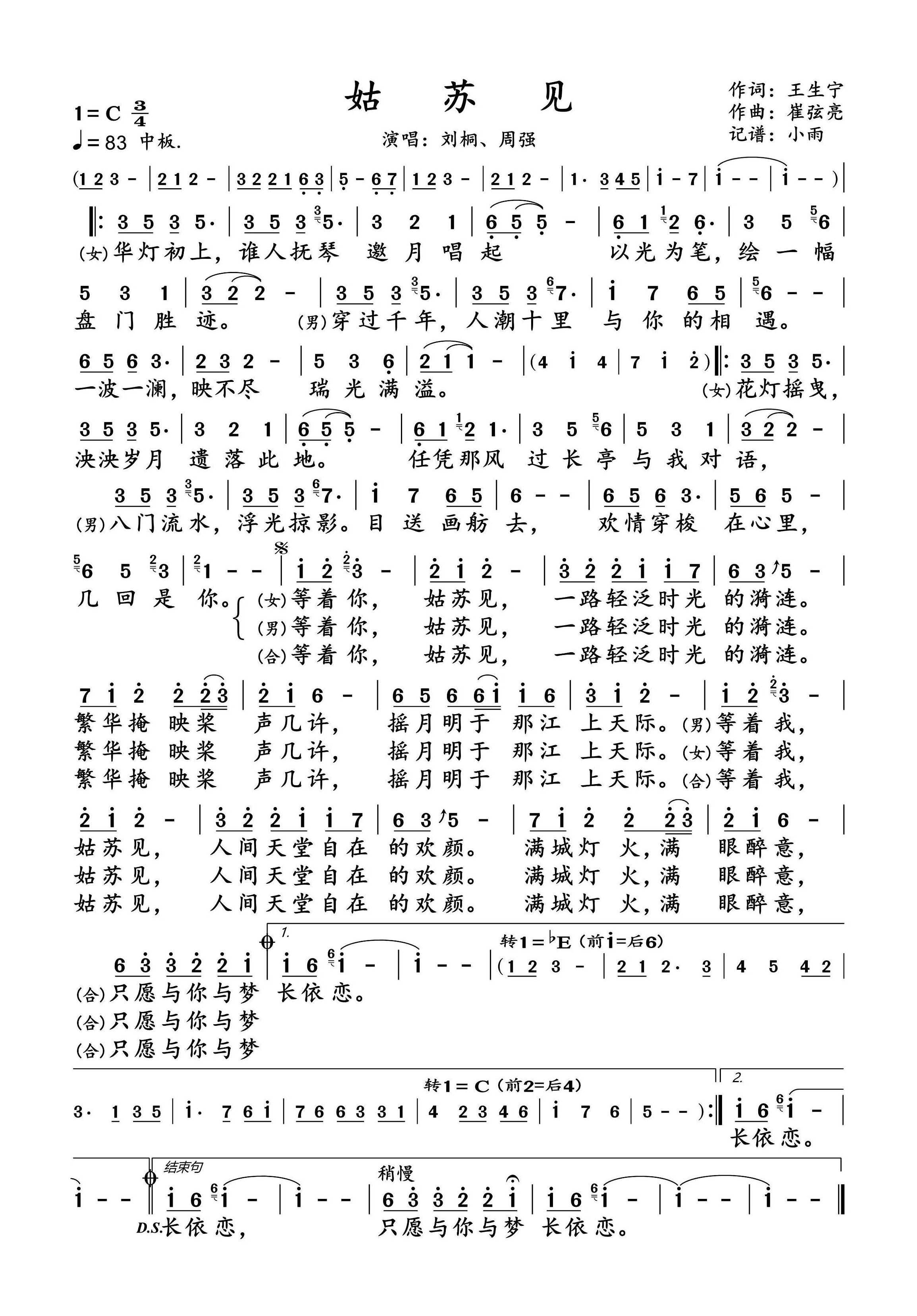 《刘桐/周强《姑苏见简谱》》内容来自于互联网,不能保证内容的准确性与完整性,仅供学习交流欣赏,请勿用于其它用途,内容版权归原作者及来源网站所有,如有侵犯到您的权益请来信告知,我们将及时删除。