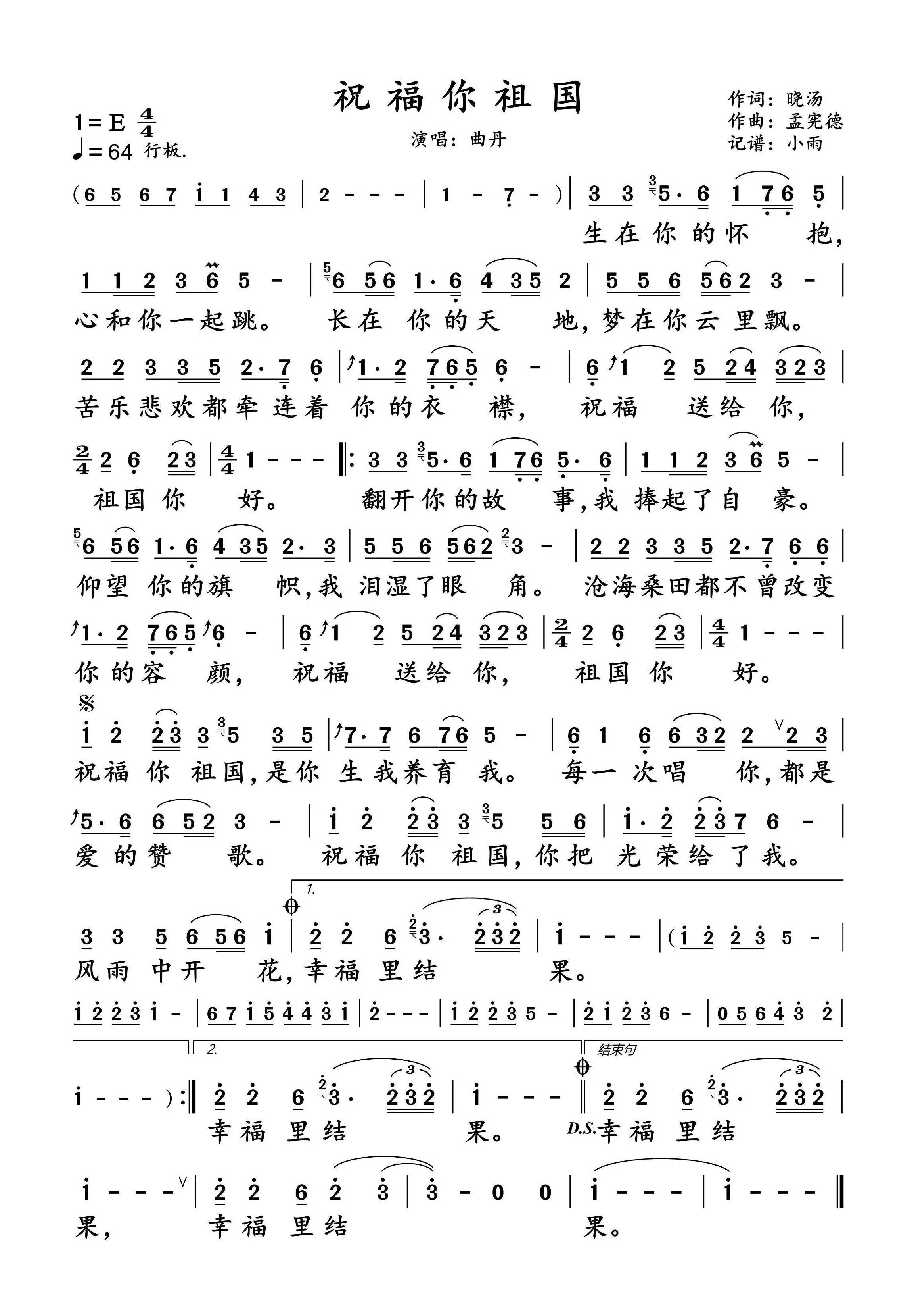 《曲丹《祝福你祖国简谱》》内容来自于互联网,不能保证内容的准确性与完整性,仅供学习交流欣赏,请勿用于其它用途,内容版权归原作者及来源网站所有,如有侵犯到您的权益请来信告知,我们将及时删除。