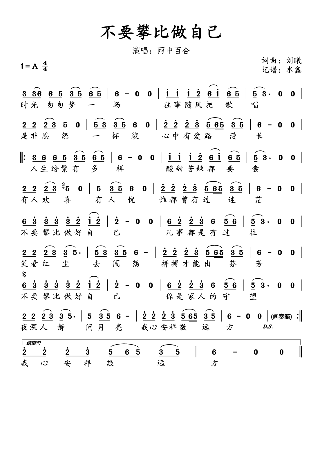 《雨中百合《不要攀比做自己简谱》》内容来自于互联网,不能保证内容的准确性与完整性,仅供学习交流欣赏,请勿用于其它用途,内容版权归原作者及来源网站所有,如有侵犯到您的权益请来信告知,我们将及时删除。