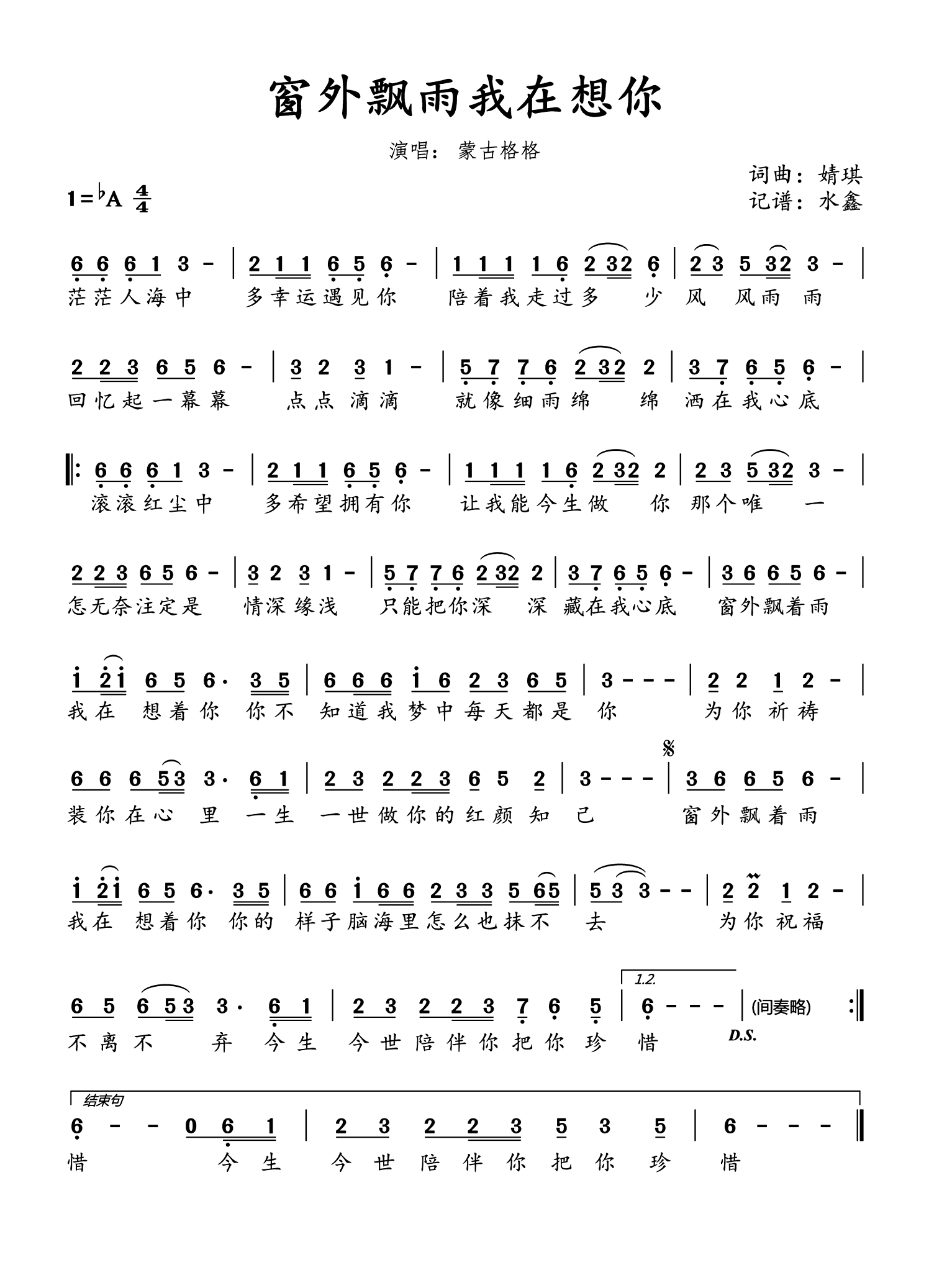 《蒙古格格《窗外飘雨我在想你简谱》》内容来自于互联网,不能保证内容的准确性与完整性,仅供学习交流欣赏,请勿用于其它用途,内容版权归原作者及来源网站所有,如有侵犯到您的权益请来信告知,我们将及时删除。
