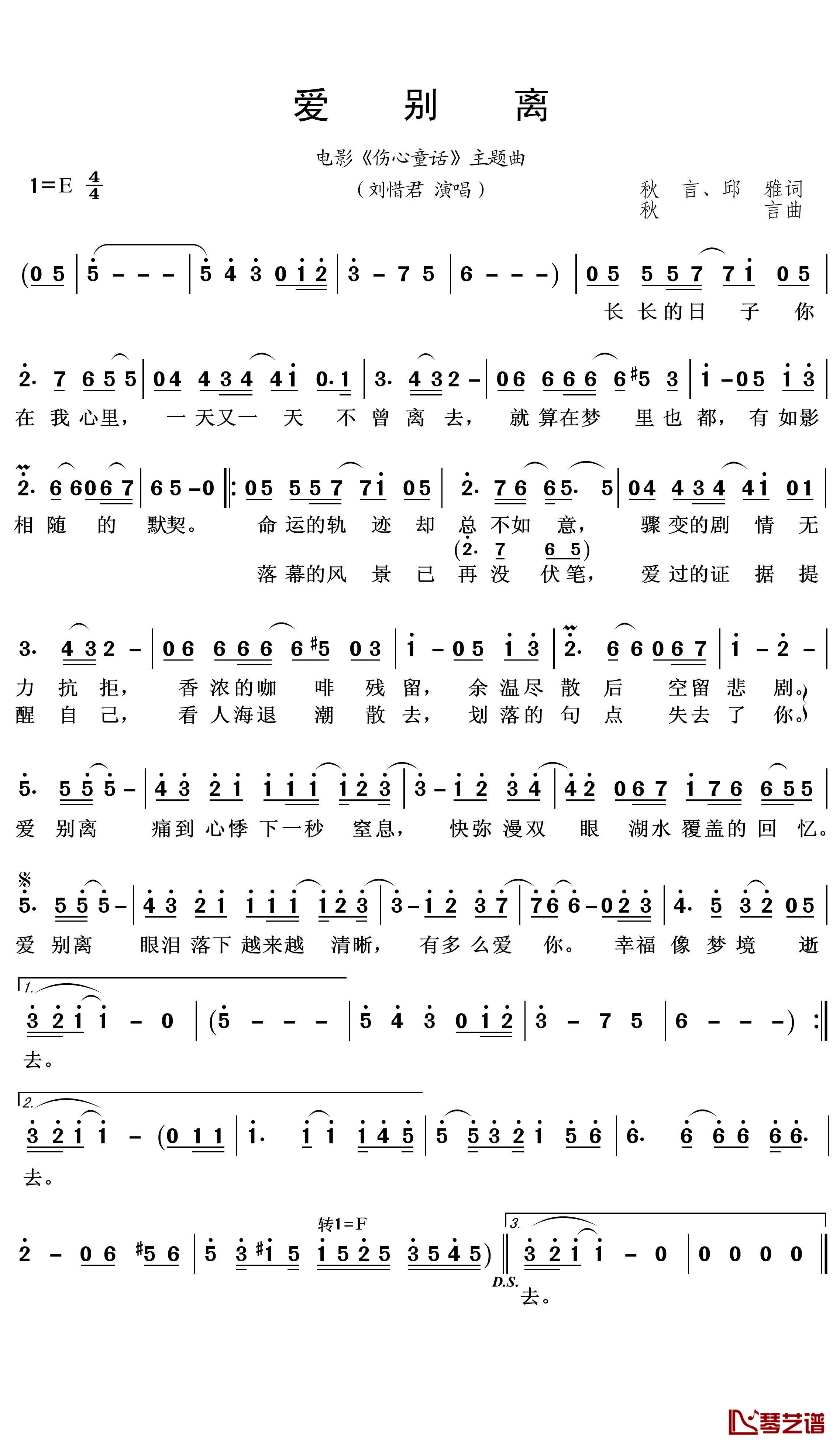 《刘惜君《爱别离简谱》》内容来自于互联网,不能保证内容的准确性与完整性,仅供学习交流欣赏,请勿用于其它用途,内容版权归原作者及来源网站所有,如有侵犯到您的权益请来信告知,我们将及时删除。