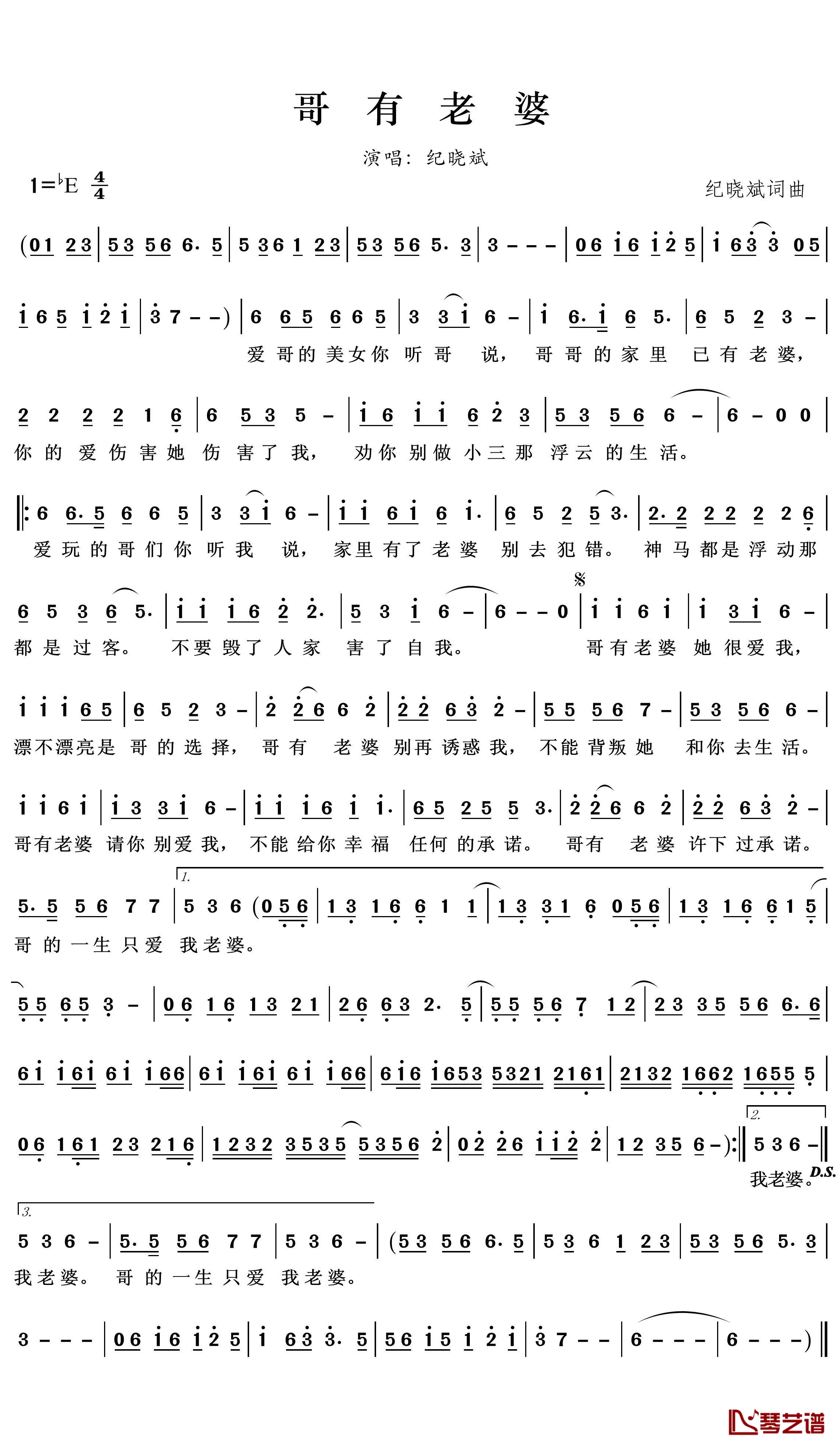 《纪晓斌《哥有老婆简谱》》内容来自于互联网,不能保证内容的准确性与完整性,仅供学习交流欣赏,请勿用于其它用途,内容版权归原作者及来源网站所有,如有侵犯到您的权益请来信告知,我们将及时删除。