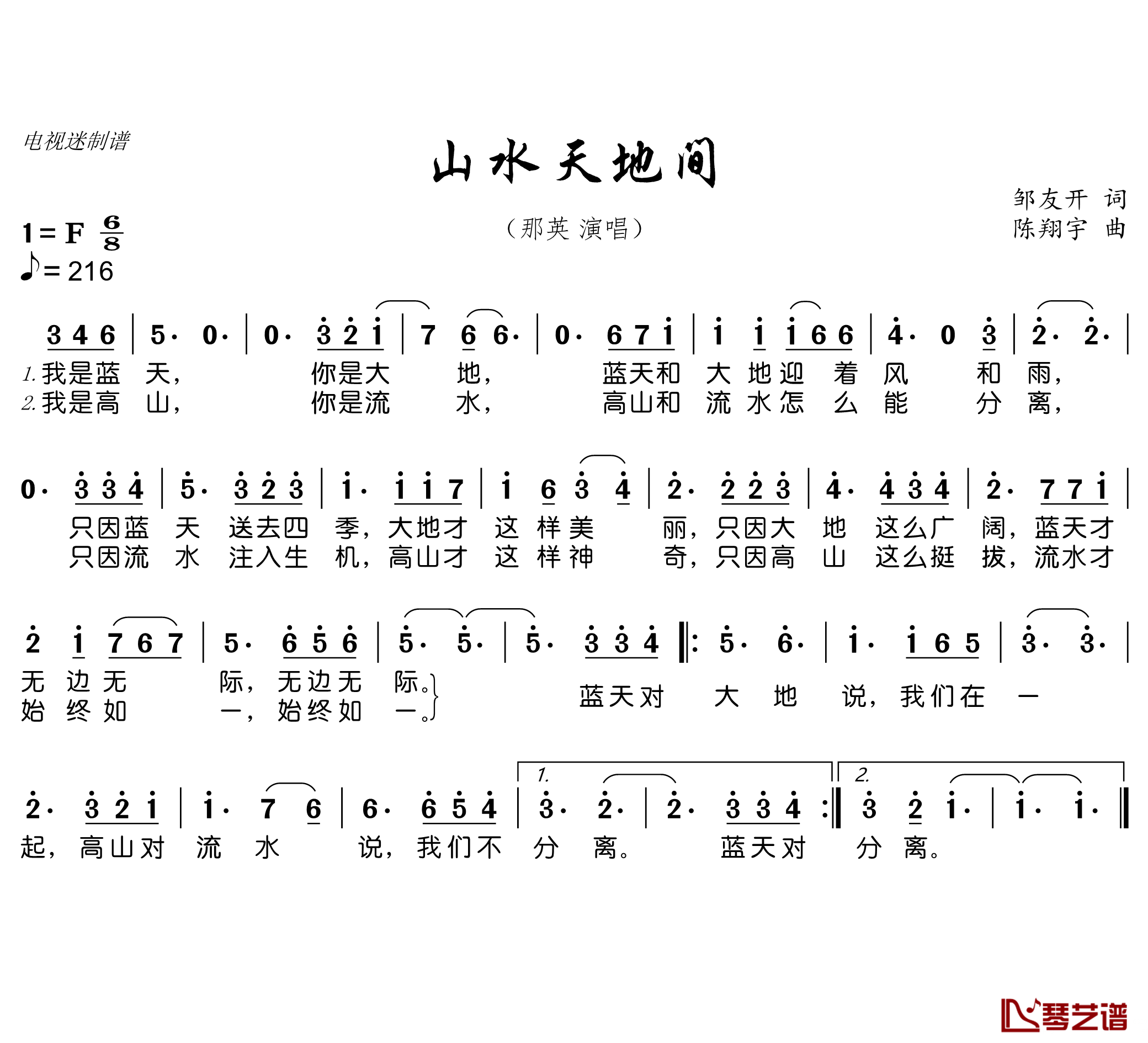 《那英《山水天地间简谱》》内容来自于互联网,不能保证内容的准确性与完整性,仅供学习交流欣赏,请勿用于其它用途,内容版权归原作者及来源网站所有,如有侵犯到您的权益请来信告知,我们将及时删除。