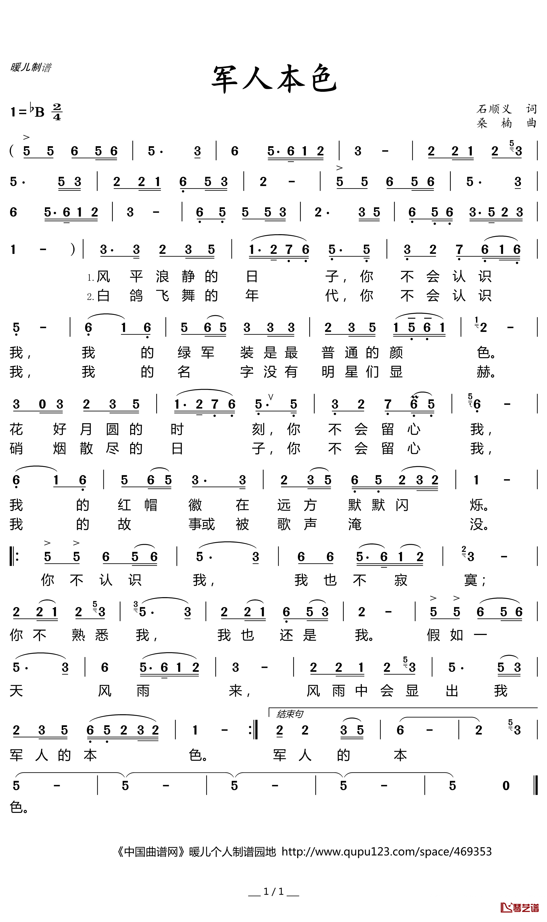 《阎维文《军人本色简谱》》内容来自于互联网,不能保证内容的准确性与完整性,仅供学习交流欣赏,请勿用于其它用途,内容版权归原作者及来源网站所有,如有侵犯到您的权益请来信告知,我们将及时删除。