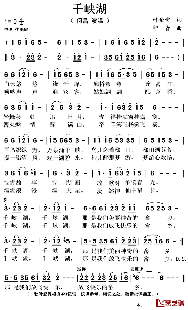 《何晶《千峡湖简谱》》内容来自于互联网,不能保证内容的准确性与完整性,仅供学习交流欣赏,请勿用于其它用途,内容版权归原作者及来源网站所有,如有侵犯到您的权益请来信告知,我们将及时删除。