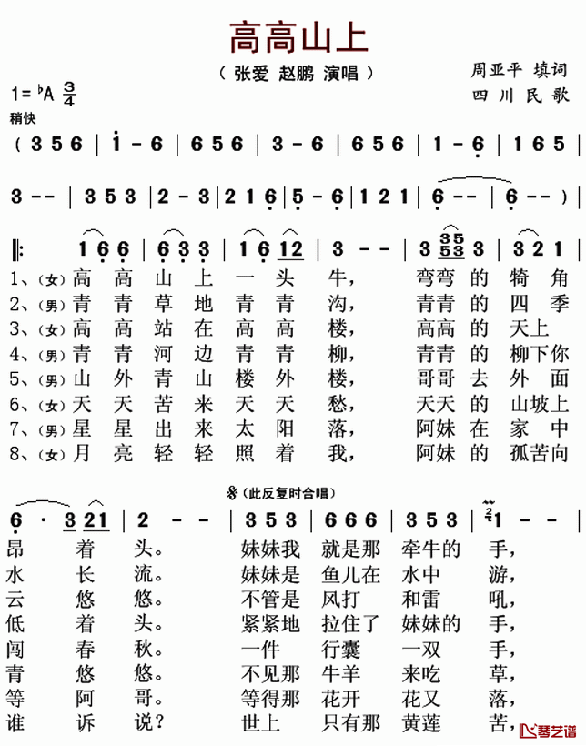 张爱赵鹏《高高山上简谱》