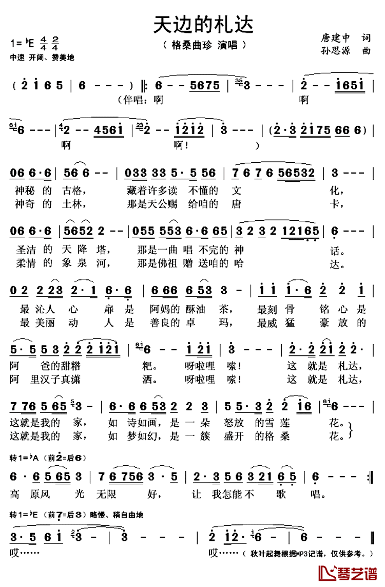 《格桑曲珍《天边的札达简谱》》内容来自于互联网,不能保证内容的准确性与完整性,仅供学习交流欣赏,请勿用于其它用途,内容版权归原作者及来源网站所有,如有侵犯到您的权益请来信告知,我们将及时删除。