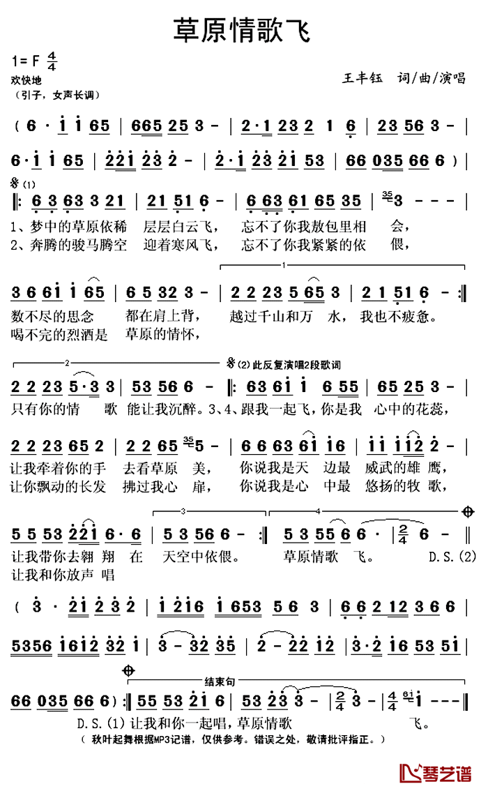 《王丰钰《草原情歌飞简谱》》内容来自于互联网,不能保证内容的准确性与完整性,仅供学习交流欣赏,请勿用于其它用途,内容版权归原作者及来源网站所有,如有侵犯到您的权益请来信告知,我们将及时删除。