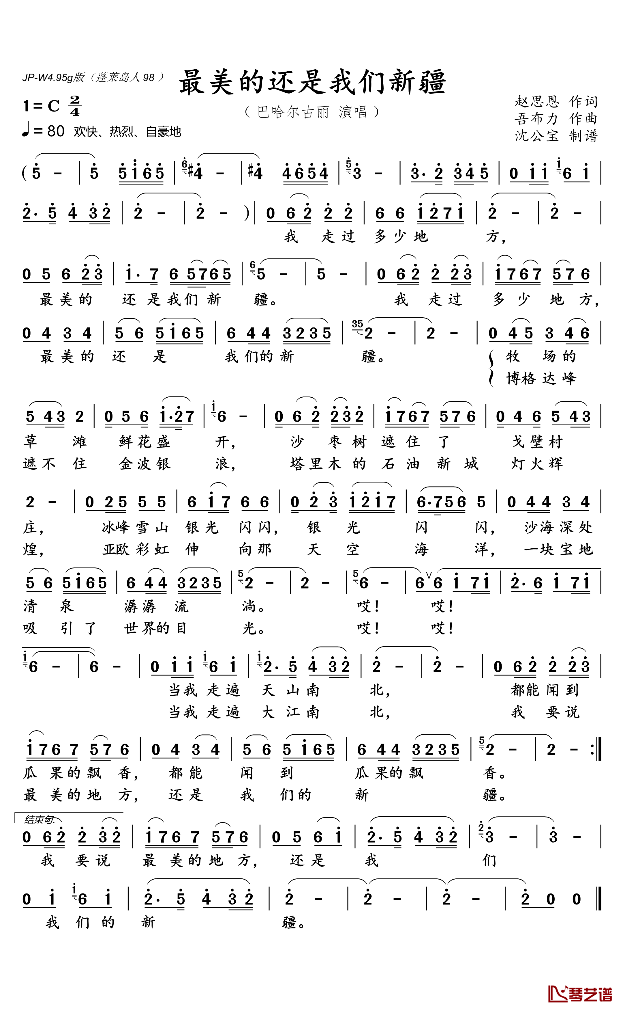 《巴哈尔古丽《最美的还是我们新疆简谱》》内容来自于互联网,不能保证内容的准确性与完整性,仅供学习交流欣赏,请勿用于其它用途,内容版权归原作者及来源网站所有,如有侵犯到您的权益请来信告知,我们将及时删除。