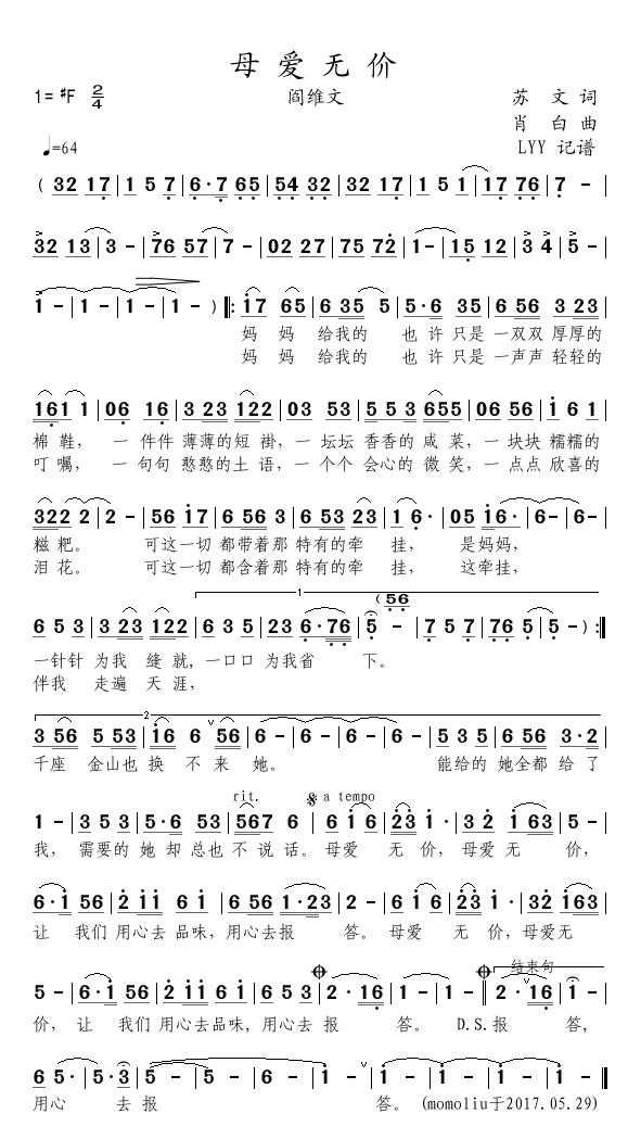 《阎维文《母爱无价简谱》》内容来自于互联网,不能保证内容的准确性与完整性,仅供学习交流欣赏,请勿用于其它用途,内容版权归原作者及来源网站所有,如有侵犯到您的权益请来信告知,我们将及时删除。