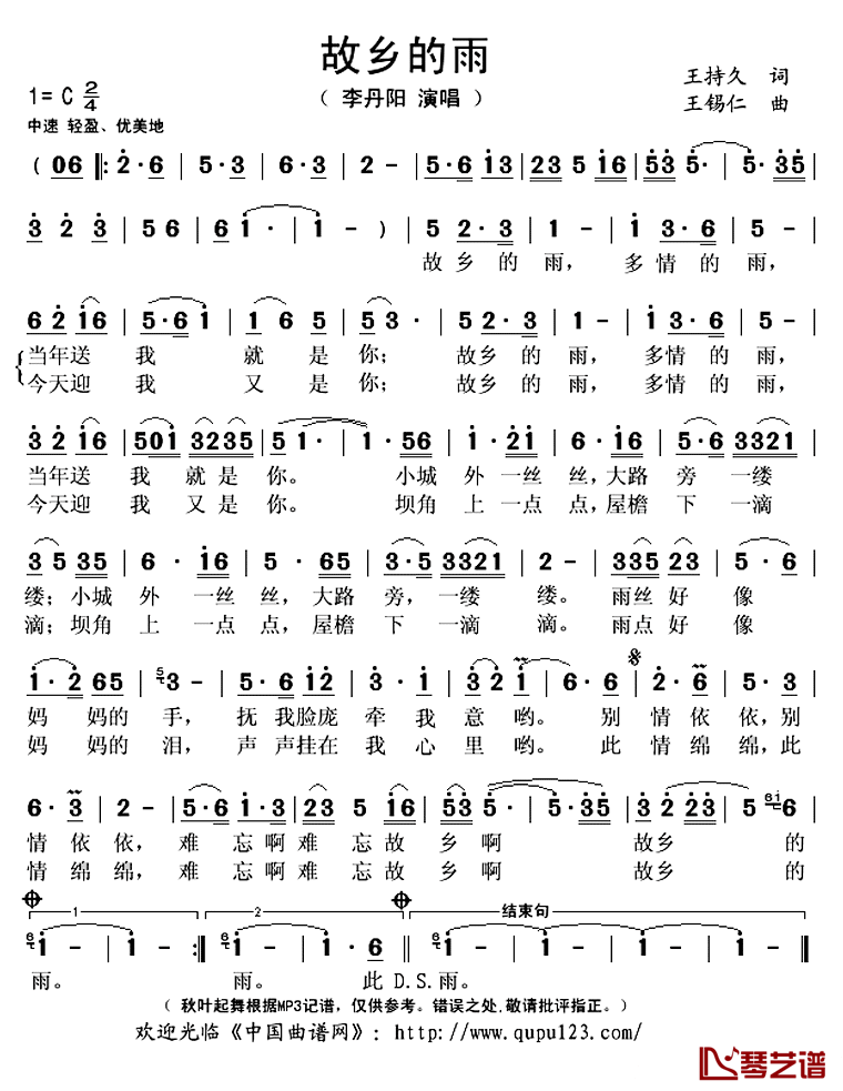 《李丹阳《故乡的雨简谱》》内容来自于互联网,不能保证内容的准确性与完整性,仅供学习交流欣赏,请勿用于其它用途,内容版权归原作者及来源网站所有,如有侵犯到您的权益请来信告知,我们将及时删除。