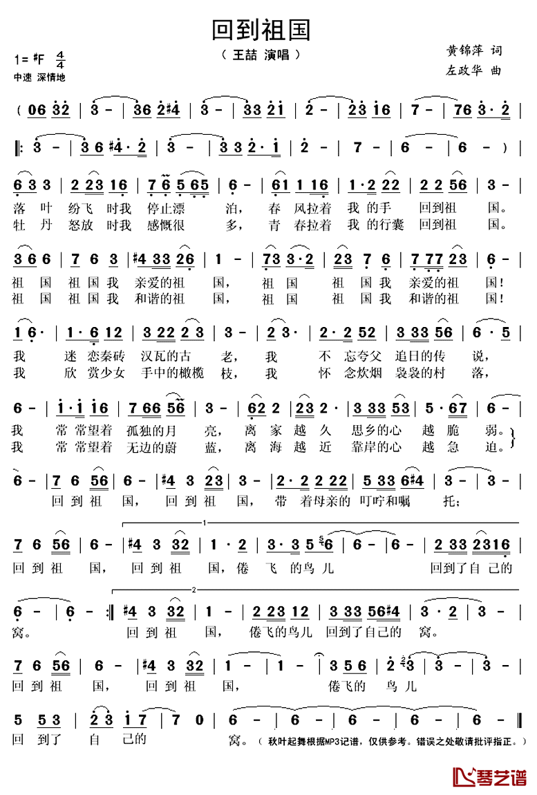 《王喆《回到祖国简谱》》内容来自于互联网,不能保证内容的准确性与完整性,仅供学习交流欣赏,请勿用于其它用途,内容版权归原作者及来源网站所有,如有侵犯到您的权益请来信告知,我们将及时删除。