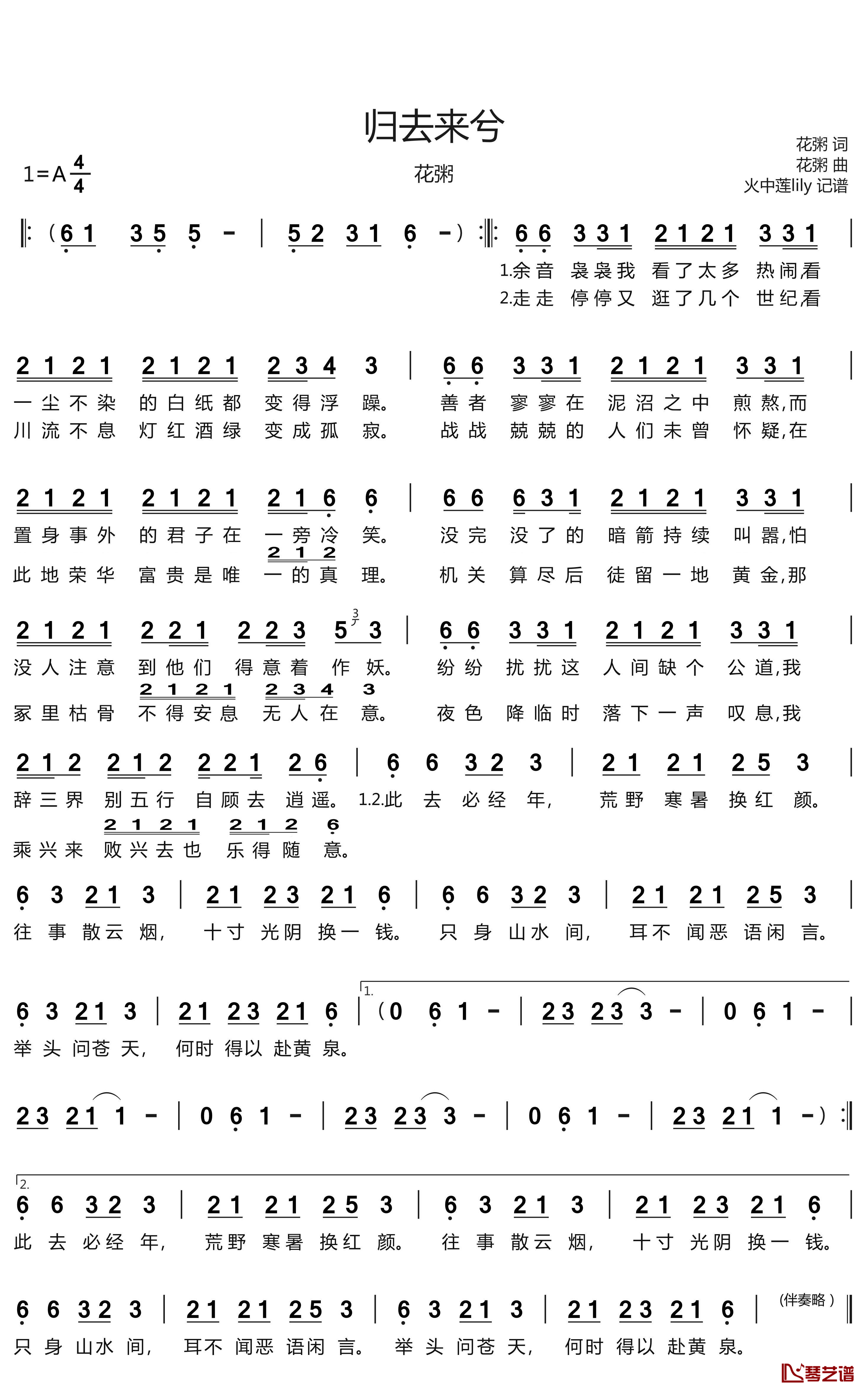 花粥《归去来兮简谱》