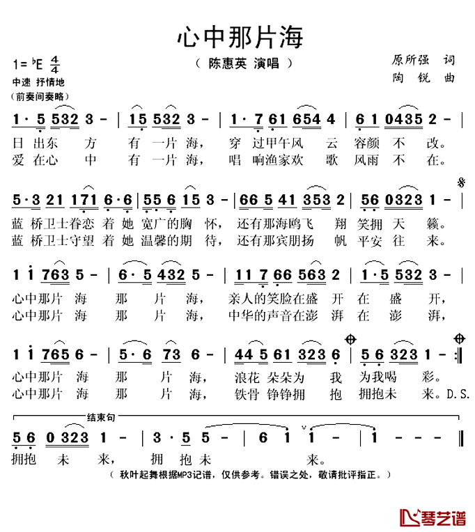 《陈惠英《心中那片海简谱》》内容来自于互联网,不能保证内容的准确性与完整性,仅供学习交流欣赏,请勿用于其它用途,内容版权归原作者及来源网站所有,如有侵犯到您的权益请来信告知,我们将及时删除。
