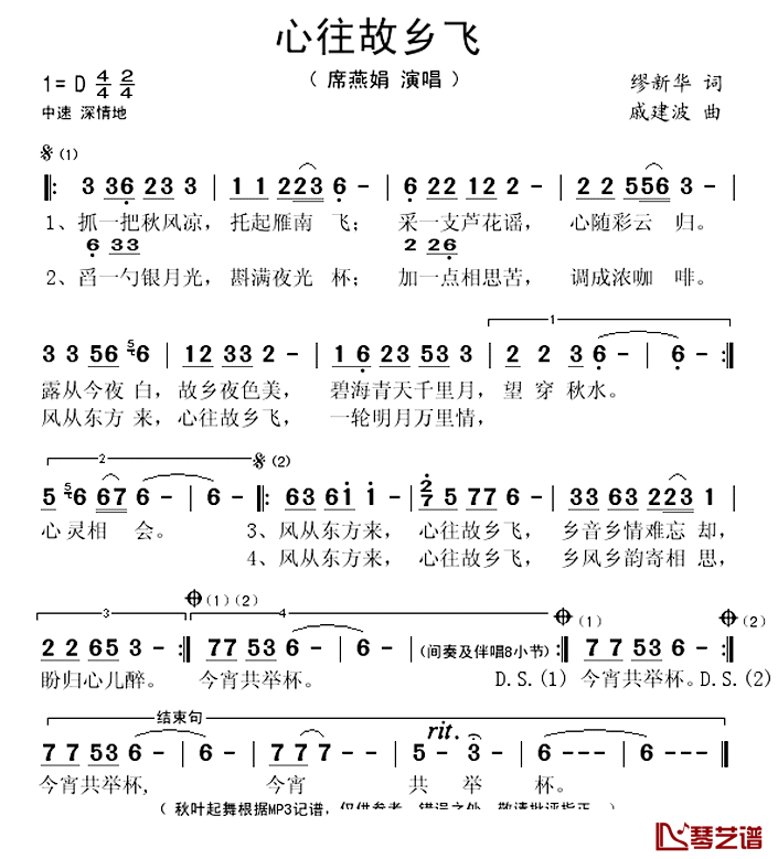 《席燕娟《心往故乡飞简谱》》内容来自于互联网,不能保证内容的准确性与完整性,仅供学习交流欣赏,请勿用于其它用途,内容版权归原作者及来源网站所有,如有侵犯到您的权益请来信告知,我们将及时删除。
