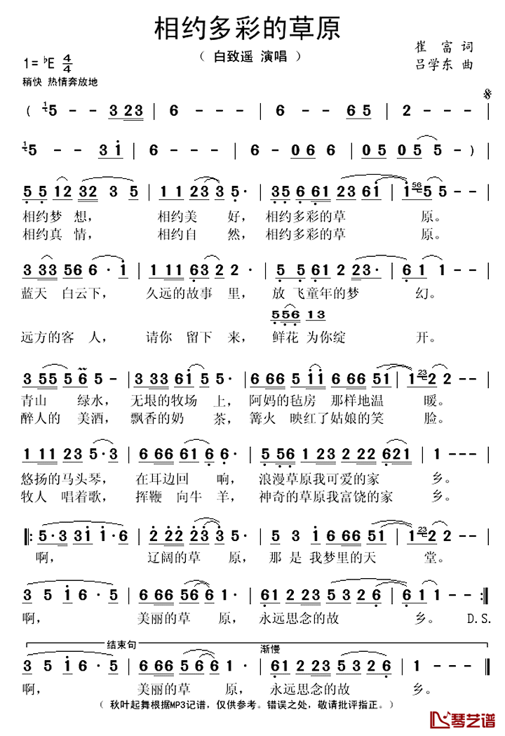 《白致遥《相约多彩的草原简谱》》内容来自于互联网,不能保证内容的准确性与完整性,仅供学习交流欣赏,请勿用于其它用途,内容版权归原作者及来源网站所有,如有侵犯到您的权益请来信告知,我们将及时删除。