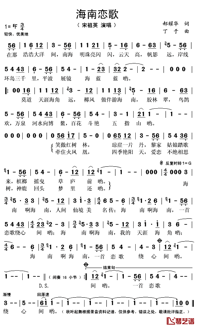 《宋祖英《海南恋歌简谱》》内容来自于互联网,不能保证内容的准确性与完整性,仅供学习交流欣赏,请勿用于其它用途,内容版权归原作者及来源网站所有,如有侵犯到您的权益请来信告知,我们将及时删除。