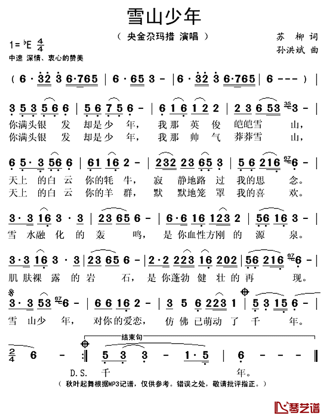 《央金尕玛措《雪山少年简谱》》内容来自于互联网,不能保证内容的准确性与完整性,仅供学习交流欣赏,请勿用于其它用途,内容版权归原作者及来源网站所有,如有侵犯到您的权益请来信告知,我们将及时删除。